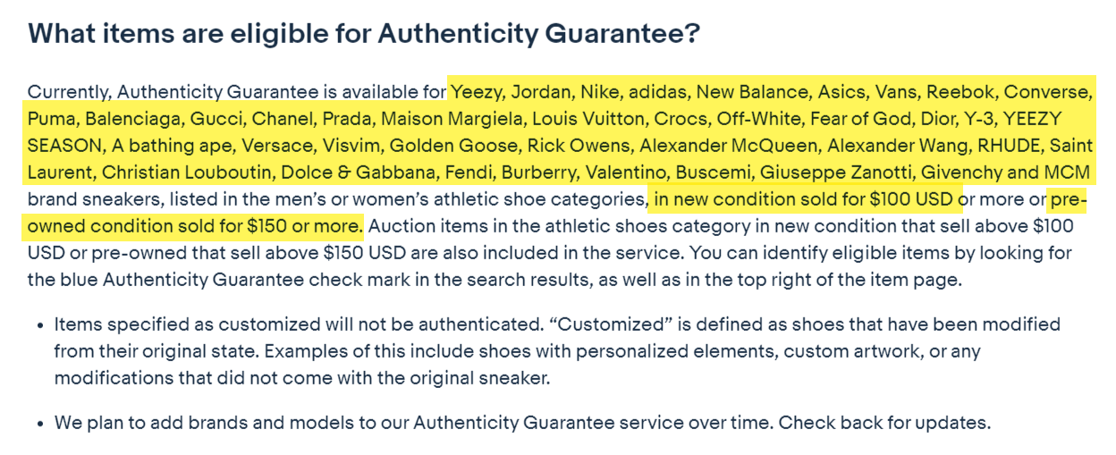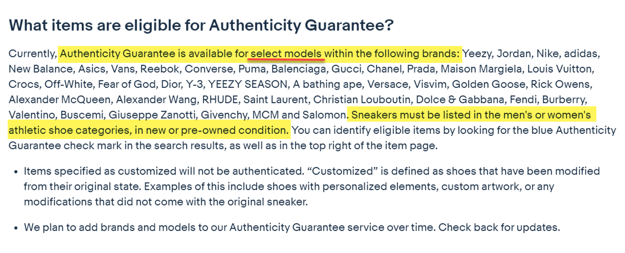 Currently, Authenticity Guarantee is available for select models within the following brands: Yeezy, Jordan, Nike, adidas, New Balance, Asics, Vans, Reebok, Converse, Puma, Balenciaga, Gucci, Chanel, Prada, Maison Margiela, Louis Vuitton, Crocs, Off-White, Fear of God, Dior, Y-3, YEEZY SEASON, A bathing ape, Versace, Visvim, Golden Goose, Rick Owens, Alexander McQueen, Alexander Wang, RHUDE, Saint Laurent, Christian Louboutin, Dolce & Gabbana, Fendi, Burberry, Valentino, Buscemi, Giuseppe Zanotti, Givenchy, MCM and Salomon.