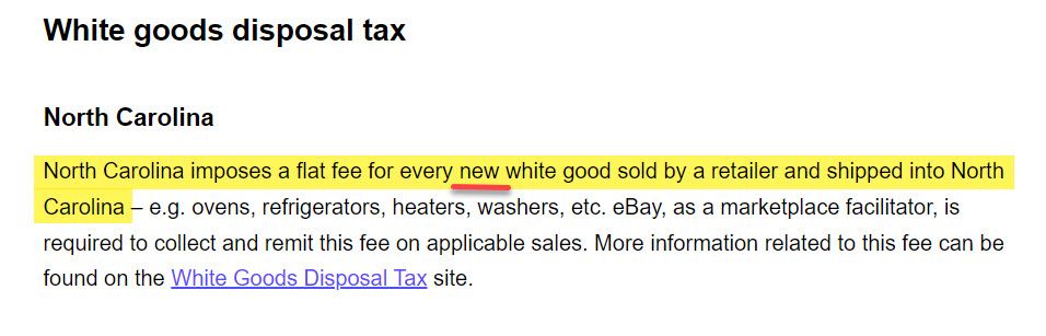 eBay's own sales tax policy page even reflects the same verbiage - "North Carolina imposes a flat fee for every new white good sold by a retailer and shipped into North Carolina."