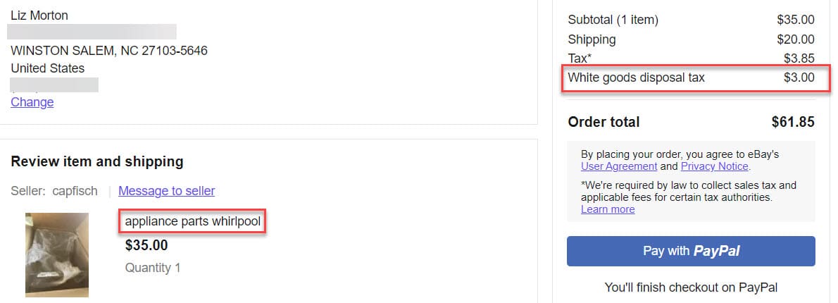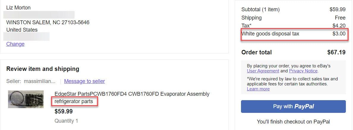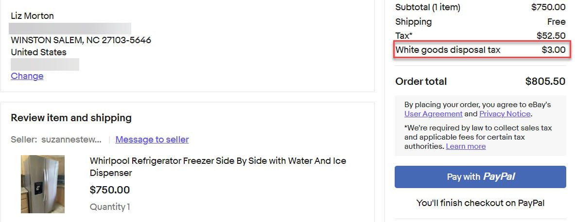Once again it seems eBay just can't seem to get collecting various state required recycling fees right - this time it is applying the North Carolina White Goods fee in error.