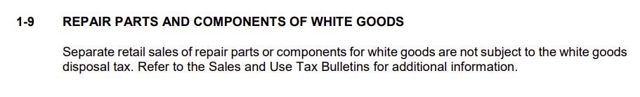 Beyond that, North Carolina Department of Revenue White Goods Disposal Tax Bulletin even explicitly states that repair parts or components are excluded.