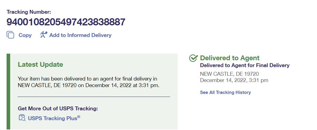 USPS tracking says Delivered to agent for final delivery. Talked to USPS and they said that the package has been delivered on their end and has been given to 3rd party forwarder to deliver to buyer.