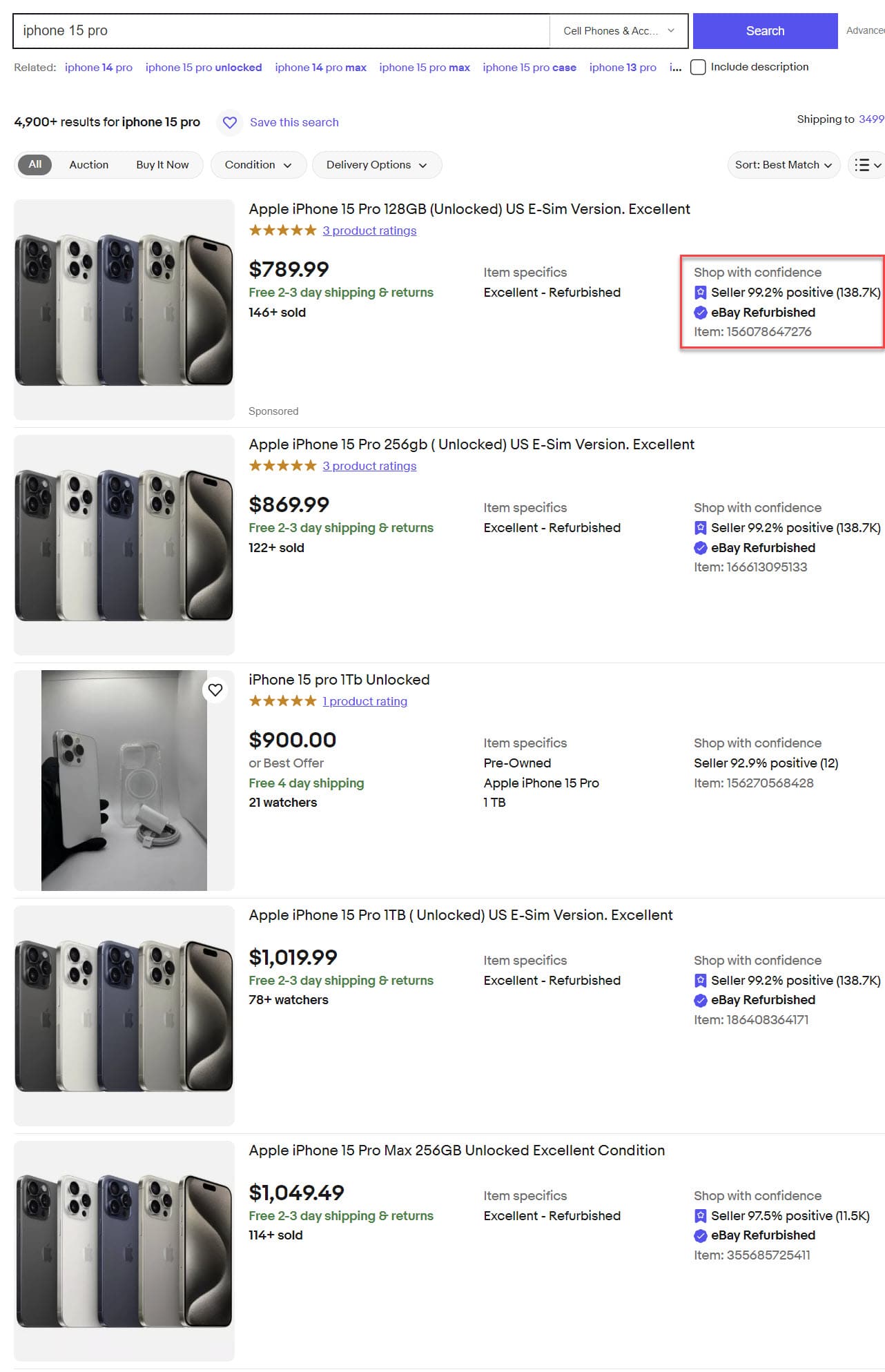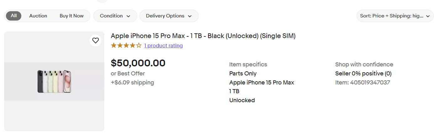 Every result also had the "shop with confidence" tagline (I went as deep as page 15 with 60 per page results) even ones like this that don't exactly inspire confidence with that price for a not working/for parts only item and 0 feedback history.