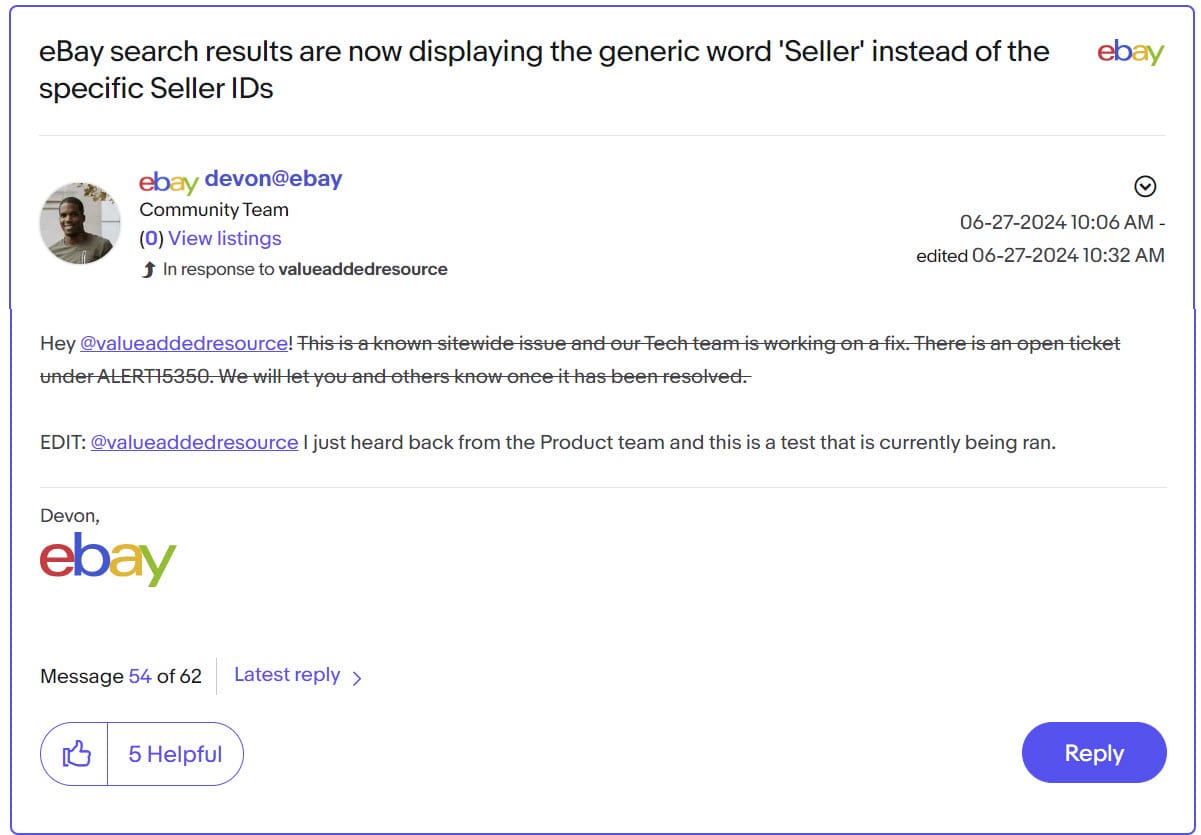 Historically, sellers have vehemently pushed back on any efforts eBay has tried to make to downplay or hide their selling IDs, store names or other important brand and trust building designs or features, but if comments in that community thread are any indication, some buyers are likely to be very much opposed to this change as well.