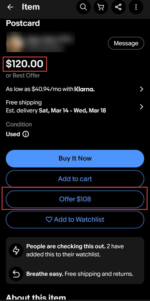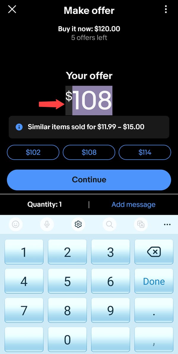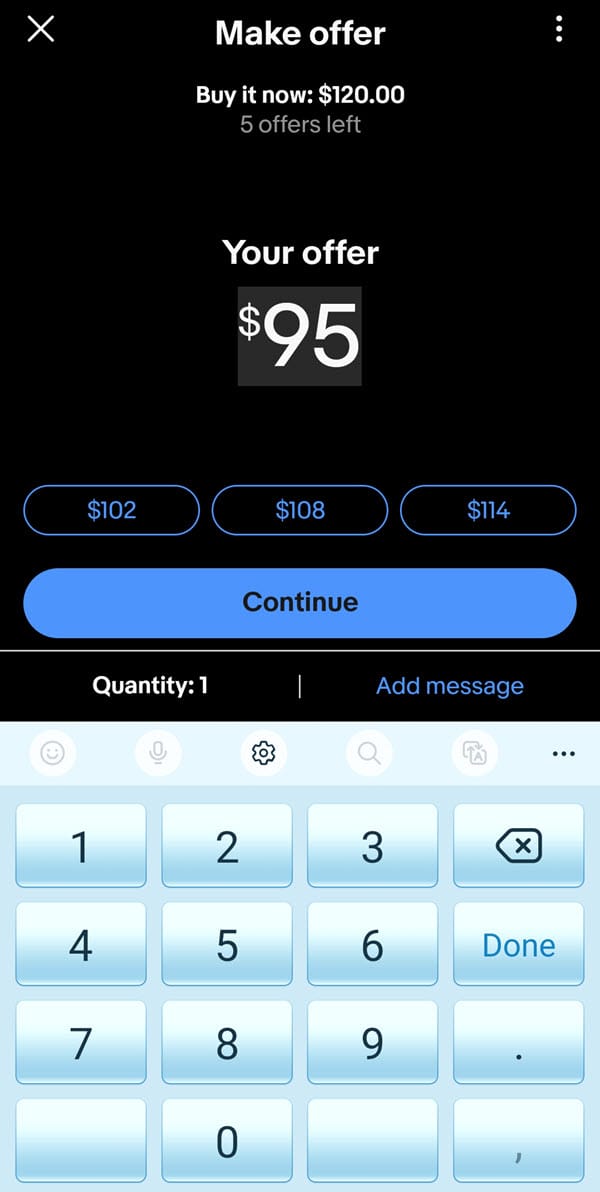 In this example, an item with a Buy It Now price of $120 is shown with a default offer of $108. If you tap the offer button, it defaults to that $108 but then also has options to tap for $102 and $114.