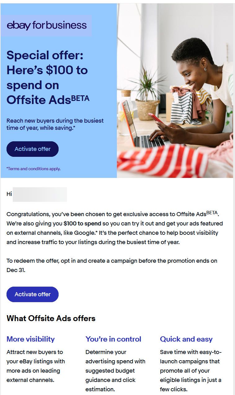 eBay is hoping to entice sellers to try out Offsite Ads beta with a promise to "reach new buyers during the busiest time of the year, while saving" with a $100 ad credit, but the devil is in the details and sellers should carefully weigh their options, especially during the all important Q4 holiday season.