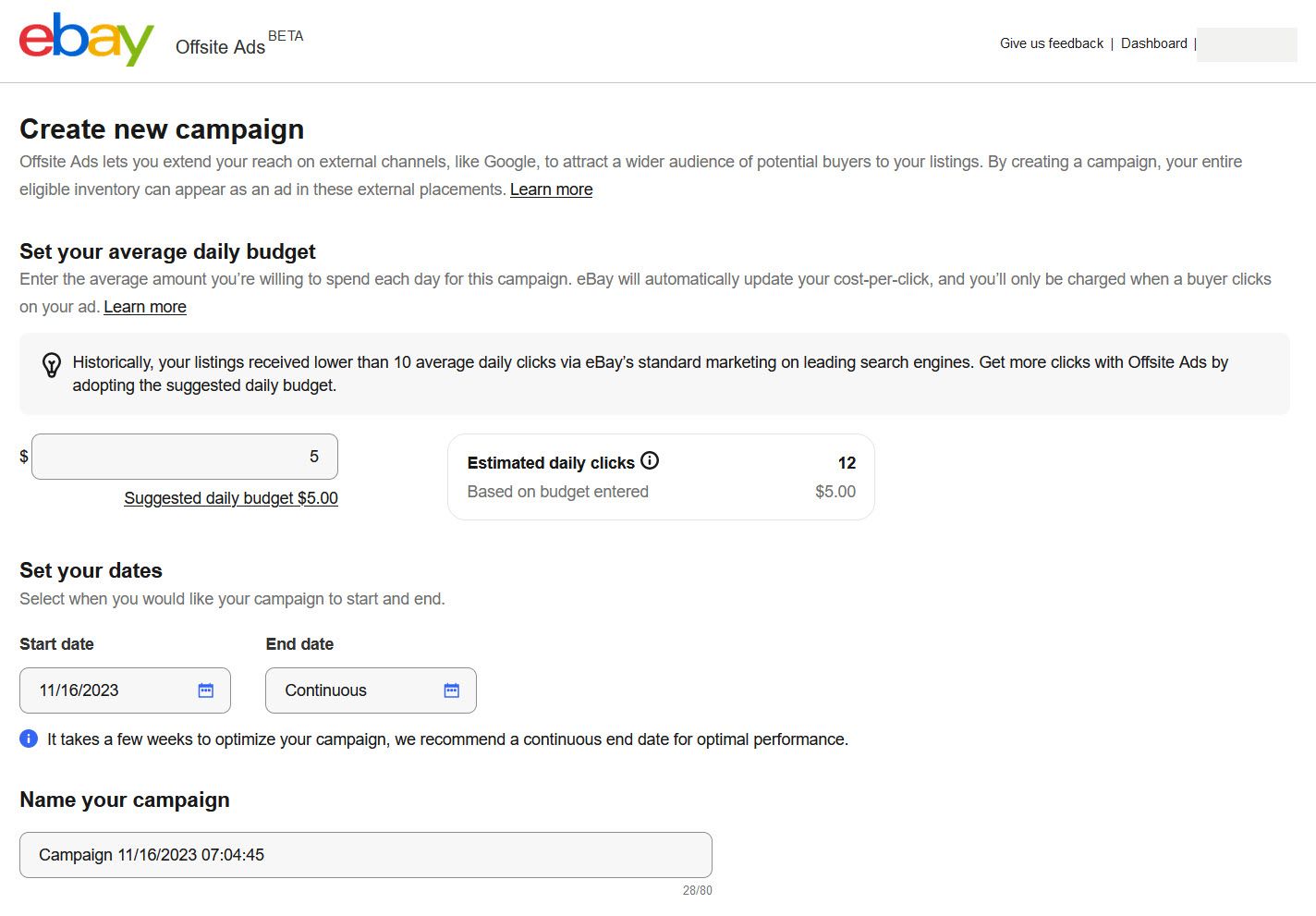 Enter the average amount you’re willing to spend each day for this campaign. eBay will automatically update your cost-per-click, and you’ll only be charged when a buyer clicks on your ad.
