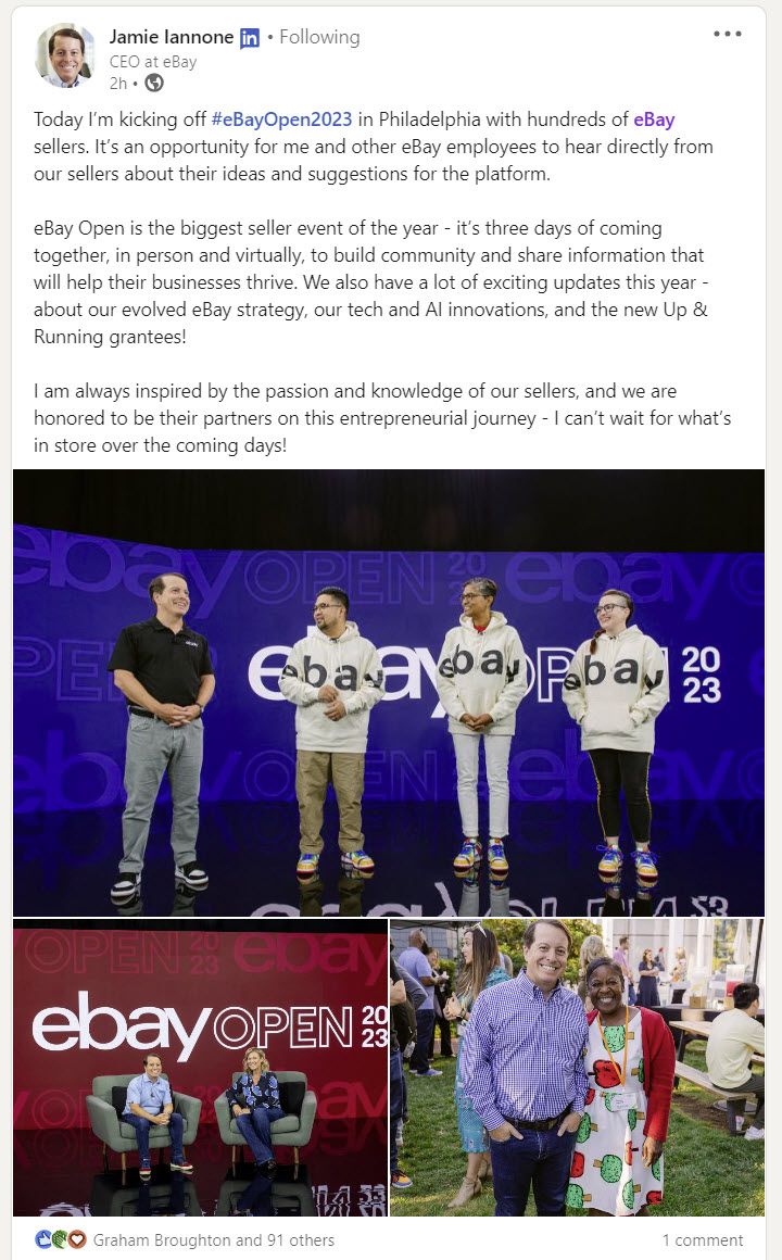 Today I’m kicking off #eBayOpen2023 in Philadelphia with hundreds of eBay sellers. It’s an opportunity for me and other eBay employees to hear directly from our sellers about their ideas and suggestions for the platform.