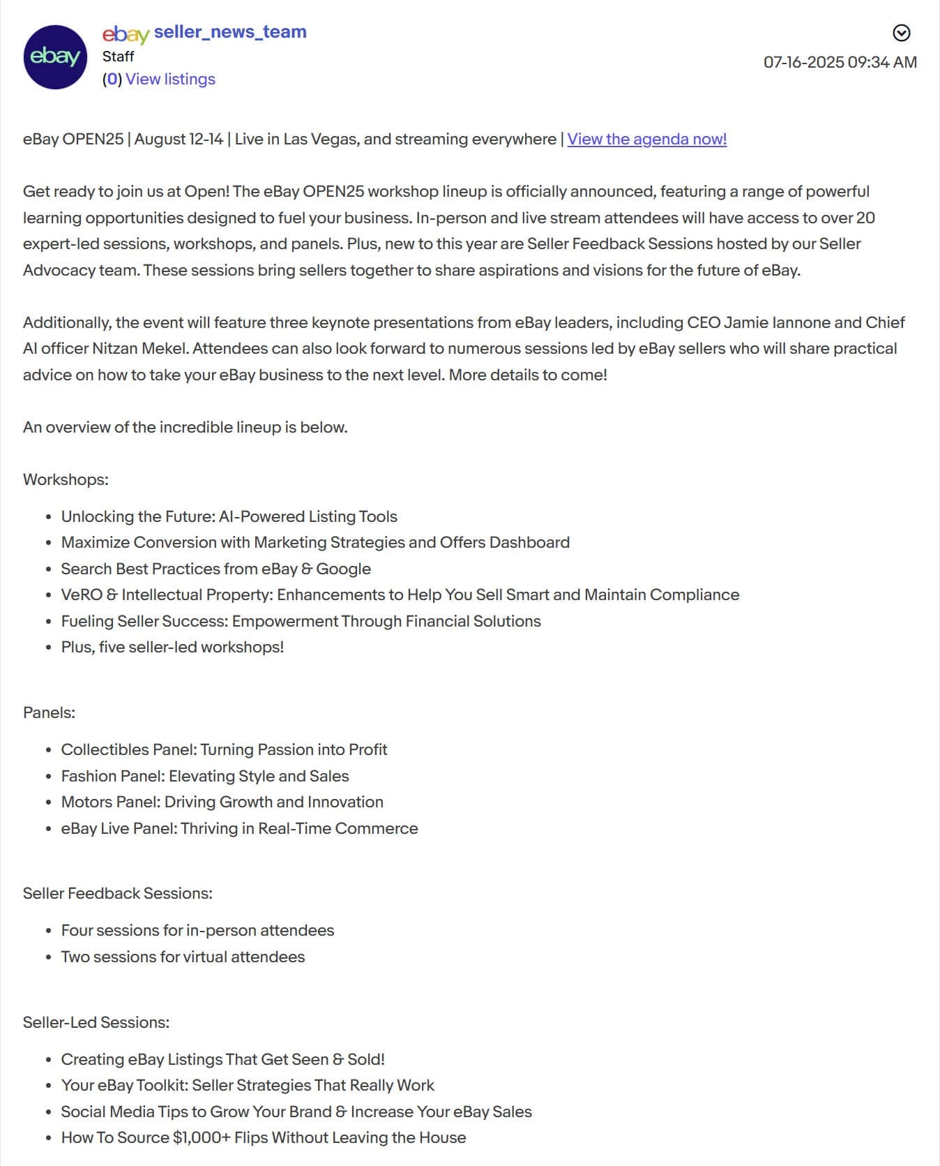 That suggests while eBay Open 2025 will be an in person experience, it may not exactly be a return to the previous size, scope and access that sellers are expecting.