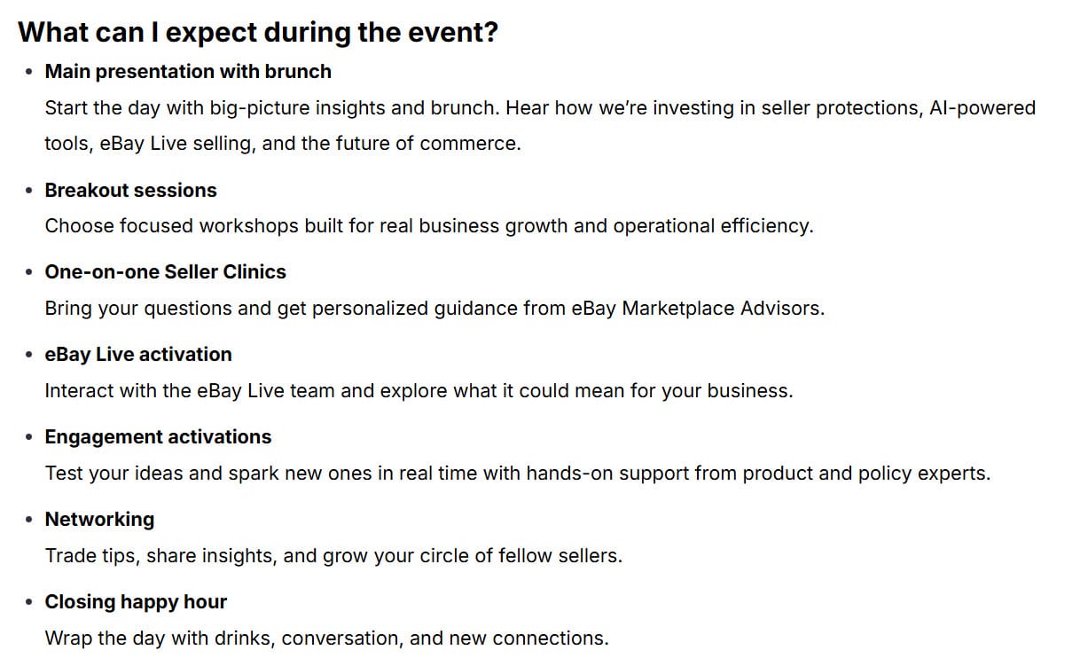 eBay says the same information will be presented at each stop, so sellers should only pick one city to attend, and for those who cannot make it to one of the in person events, a recorded replay will be provided as part of the Winter Seller Check In on October 8, 2026.