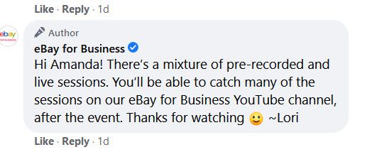 It's troubling to me that eBay wasn't more transparent about this. One response to a comment on the eBay for Business Facebook page is the only place I found any mention from an official eBay source that some content was pre-recorded. There was nowhere in the event FAQ or on the sessions themselves that made it explicitly clear which content was being presented live and which was pre-recorded.