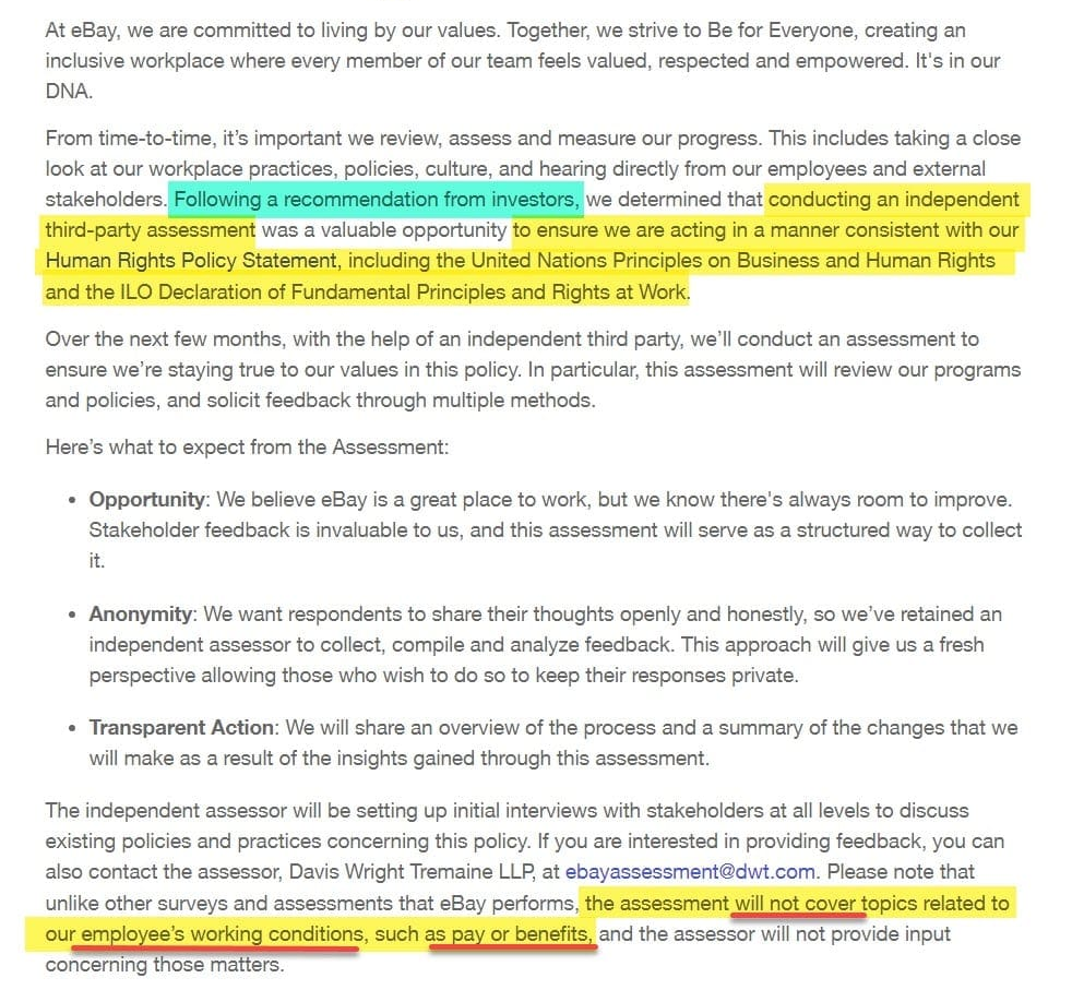 The company also recently undertook an "investor recommended" indepedendant Values Assessment, with the purported goal of determining if eBay is living up to the principals of their published Human Rights Policy, including respecting the rights of workers to organize as well as commitments to equal opportunity employment and providing a harassment and discrimination-free workplace.