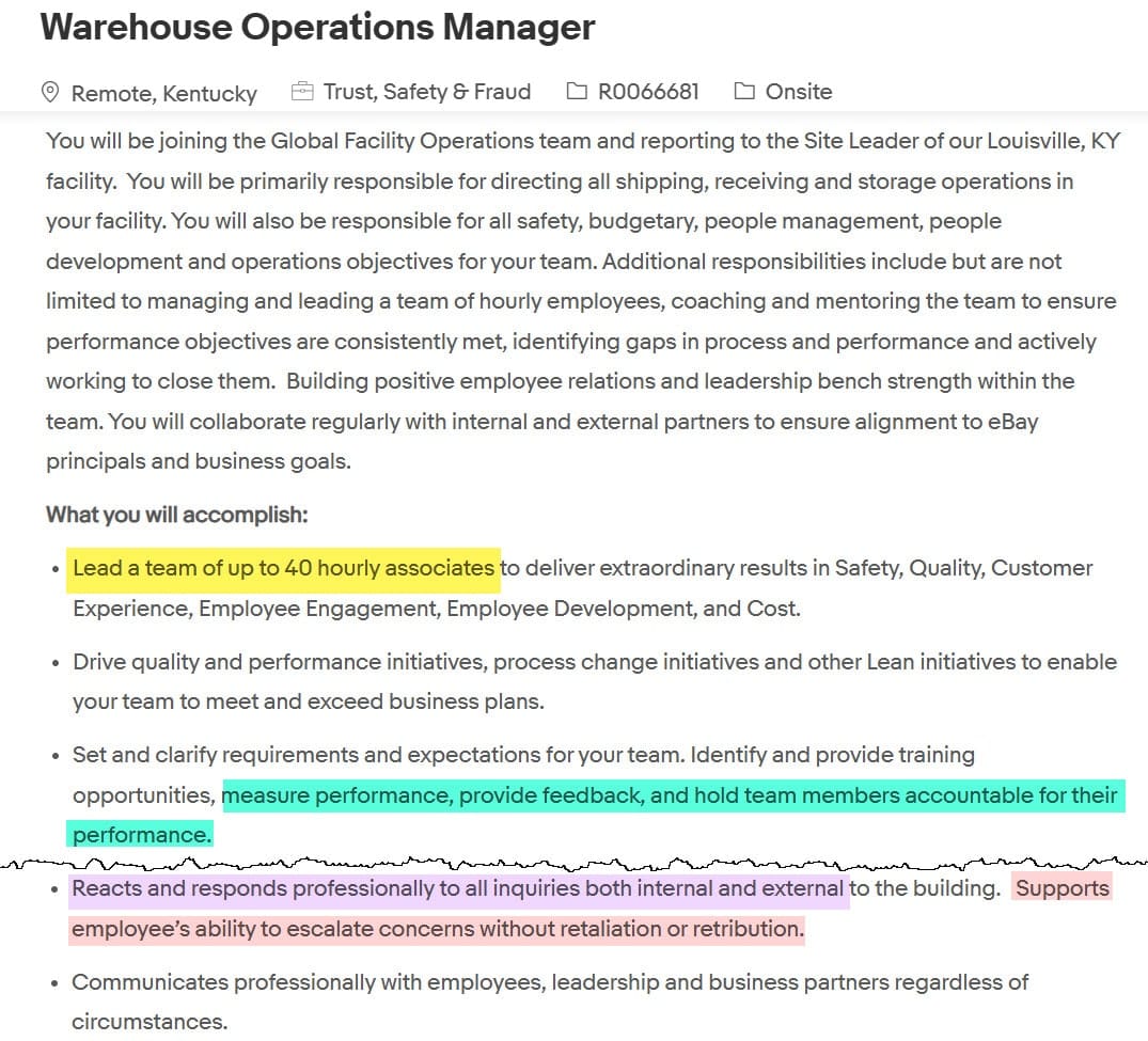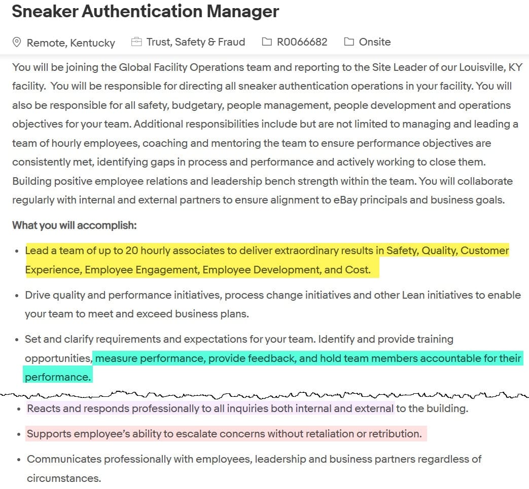 Notably, for both the Warehouse Operations and Sneaker Authentication Manager roles, eBay apparently thought it was necessary to explicitly call out they are looking to hire someone who can "support employee’s ability to escalate concerns without retaliation or retribution."