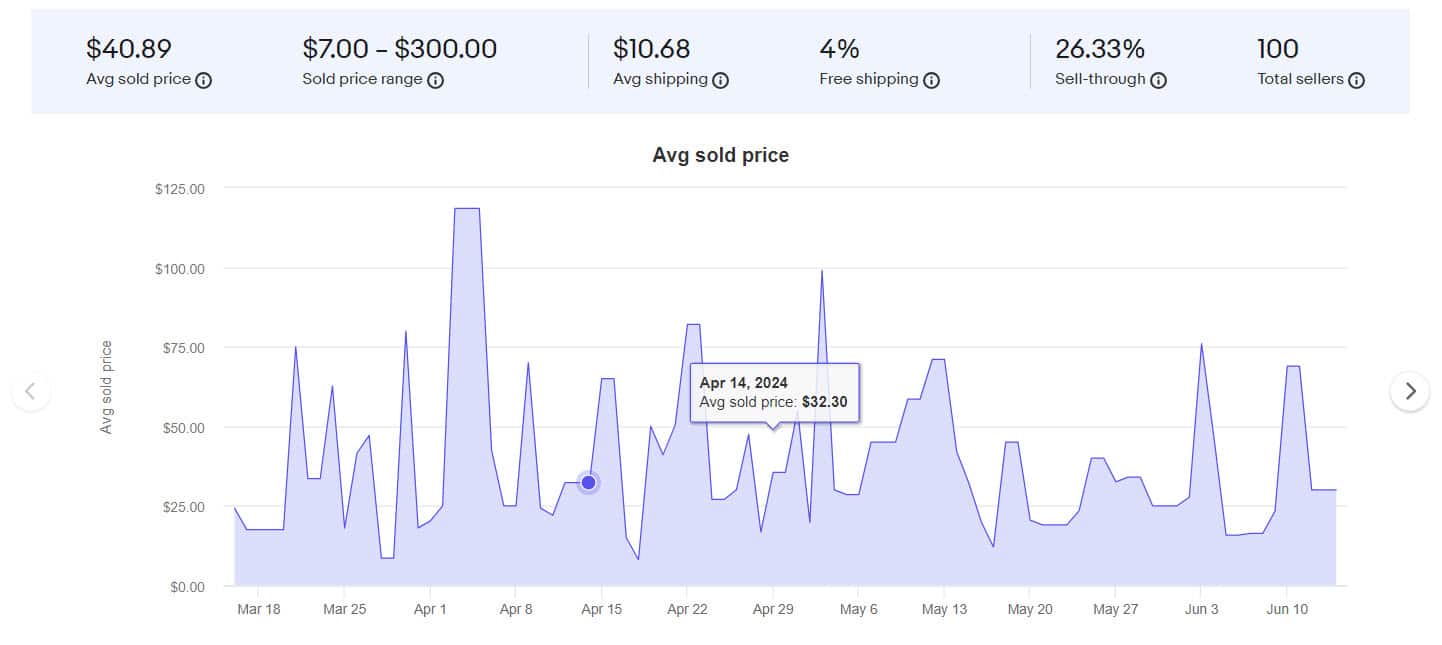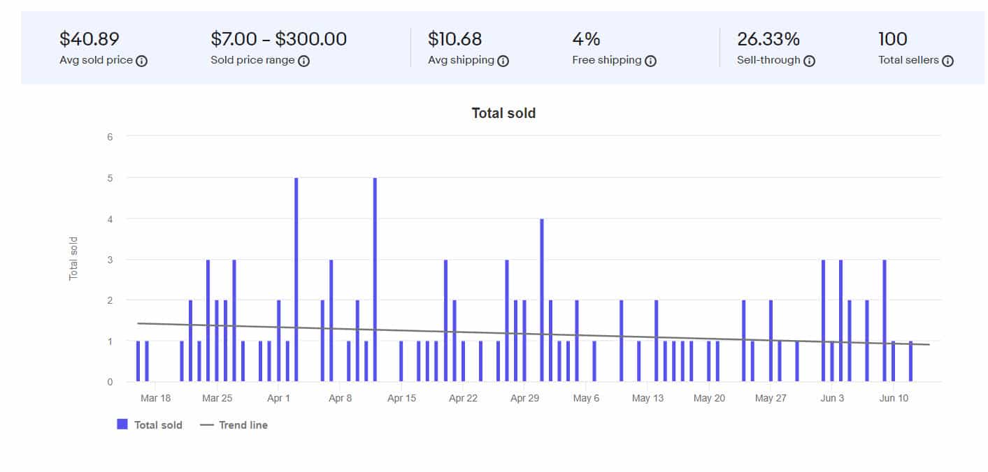 Turning on the "Show sales trends" toggle does provide charts with some useful information, however the chart for pricing only shows daily averages, not actual totals, and the chart for total sold only gives daily numbers, requiring the user to do a bunch of manual math if they wanted to try to determine the total over a longer period of time.