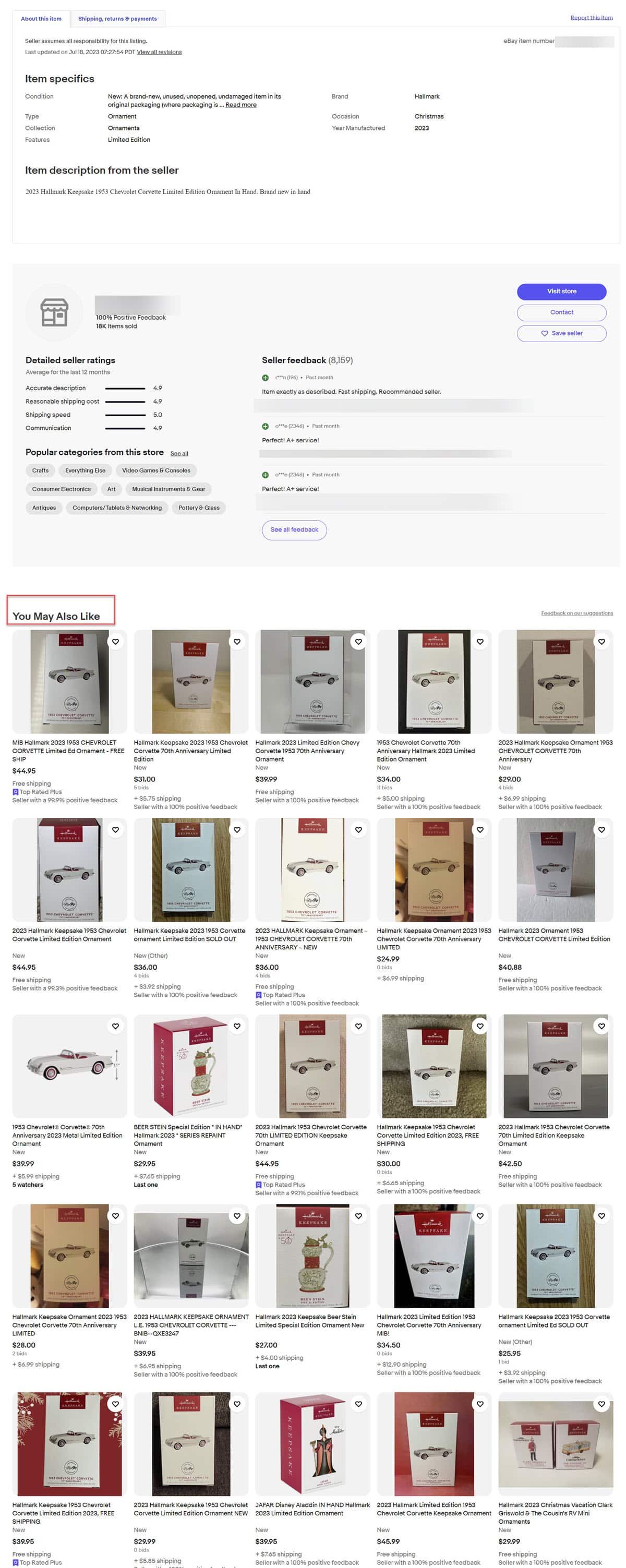 - Chrome logged in: 2 rows of PL above description with "see more" that goes to full page of other items, 25 other items below description/feedback labeled as "You May Also Like" (presumably organic, but may also be "halo")