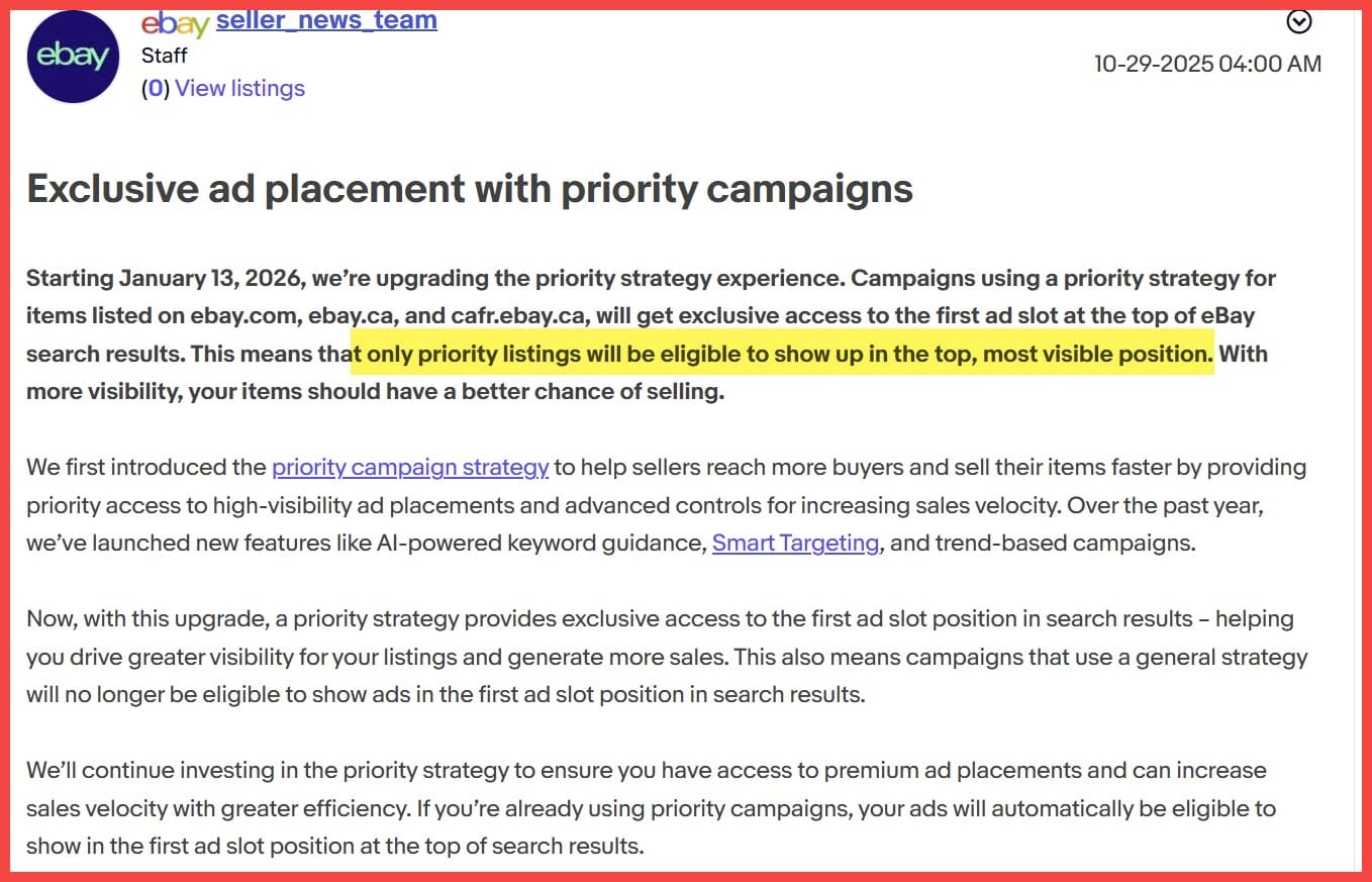 Starting January 13, 2026, we’re upgrading the priority strategy experience. Campaigns using a priority strategy for items listed on ebay.com, ebay.ca, and cafr.ebay.ca, will get exclusive access to the first ad slot at the top of eBay search results. This means that only priority listings will be eligible to show up in the top, most visible position. With more visibility, your items should have a better chance of selling.