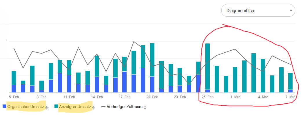 For example, this German seller did not change anything about their business but once the new attribution model went into effect starting February 26, almost every sale was attributed to Promoted Listings (green) with only a tiny amount of organic sales (blue) compared to previous days under the old attribution model.