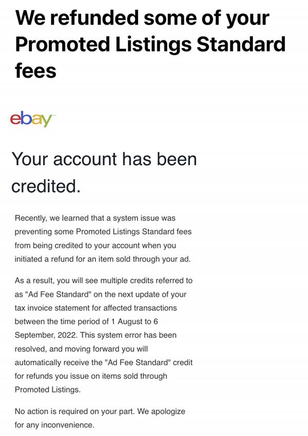 Recently, we learned that a system issue was preventing some Promoted Listings Standard fees from being credited to yoru account when you initiated a refund for an item sold through your ad.