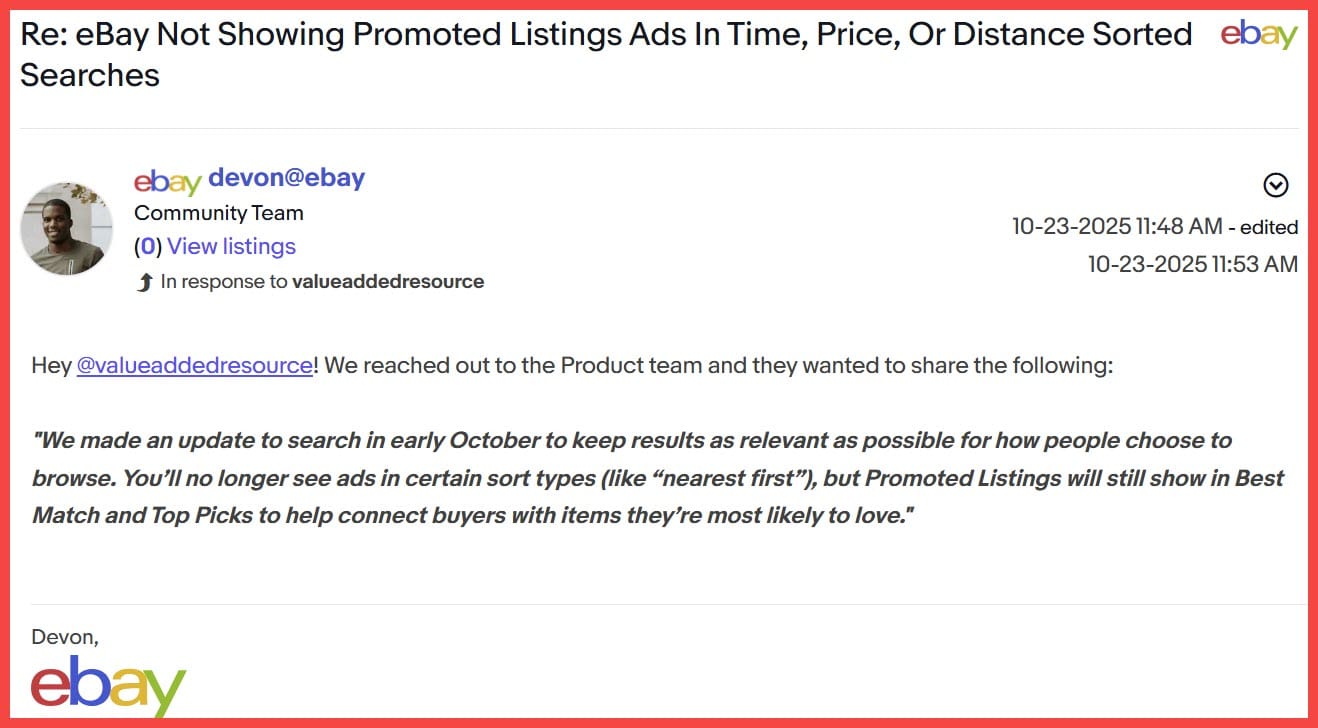 Stay tuned for updates and let us know in the comments below if you are seeing Promoted Listings ads no longer being shown in Time, Distance, or Price sorted eBay searches.