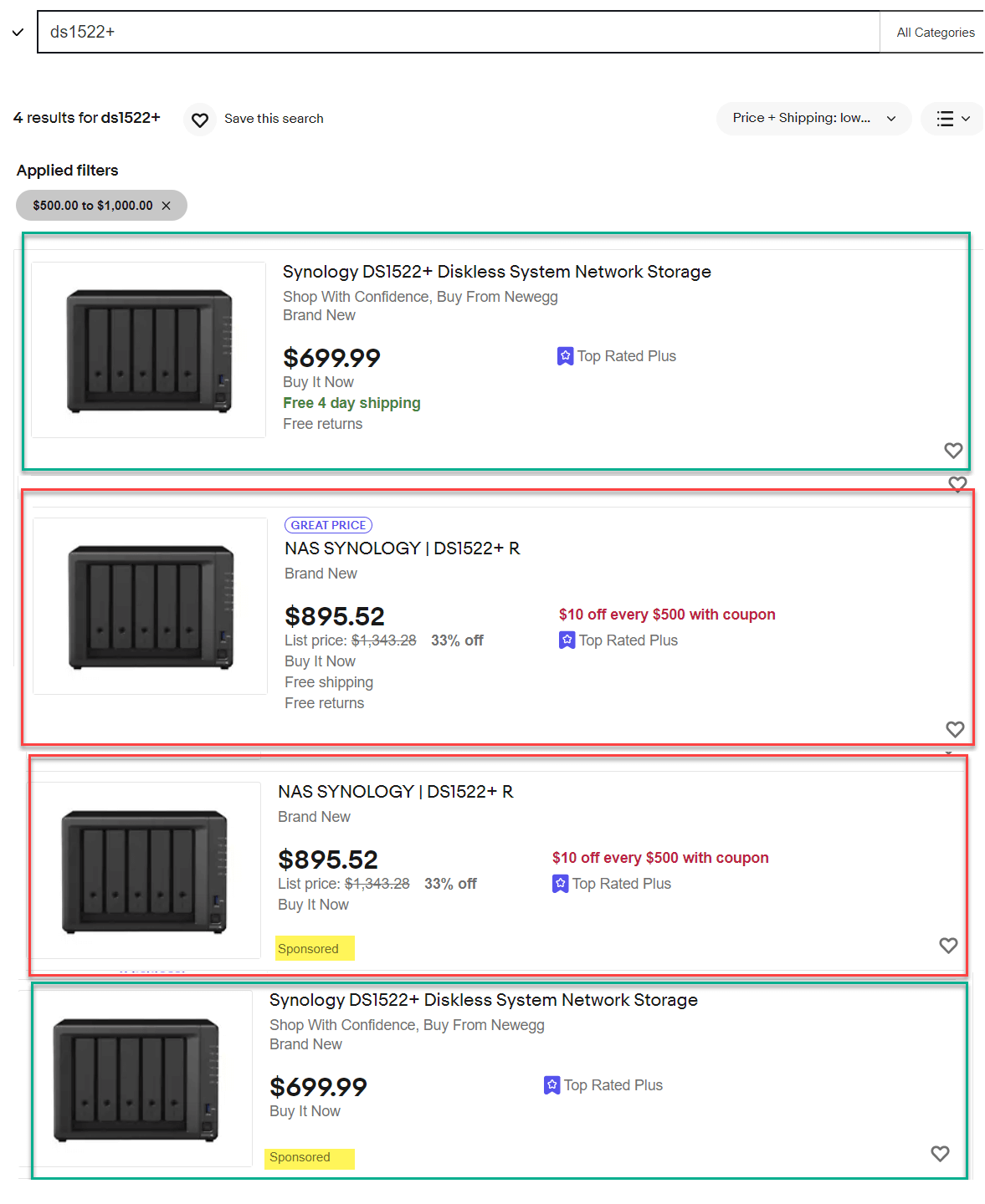 For example, in this screenshot from 2022,the Price+Shipping lowest first sort option resulted in two distinct listings each being shown twice - once as an organic result and once as a sponsored Promoted Listing result.