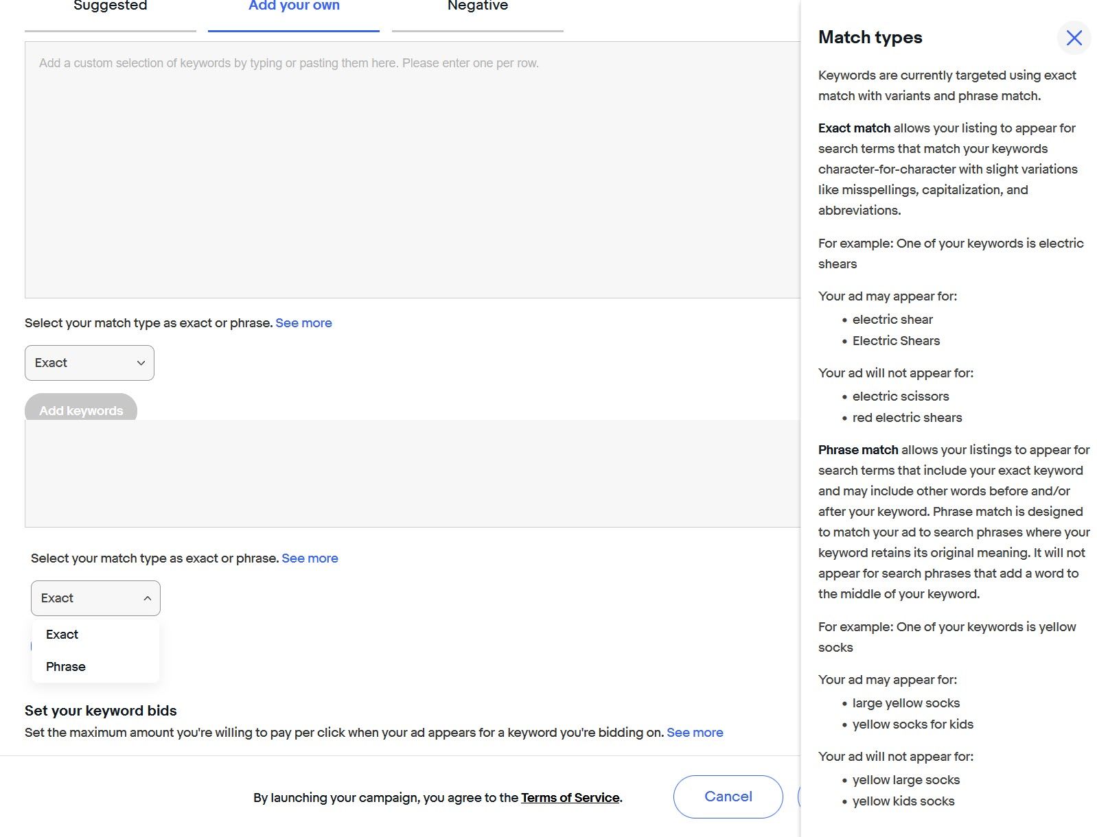 Exact match allows your listing to appear for search terms that match your keywords character for character with slight variations like misspellings, capitalization, and abbreviations.