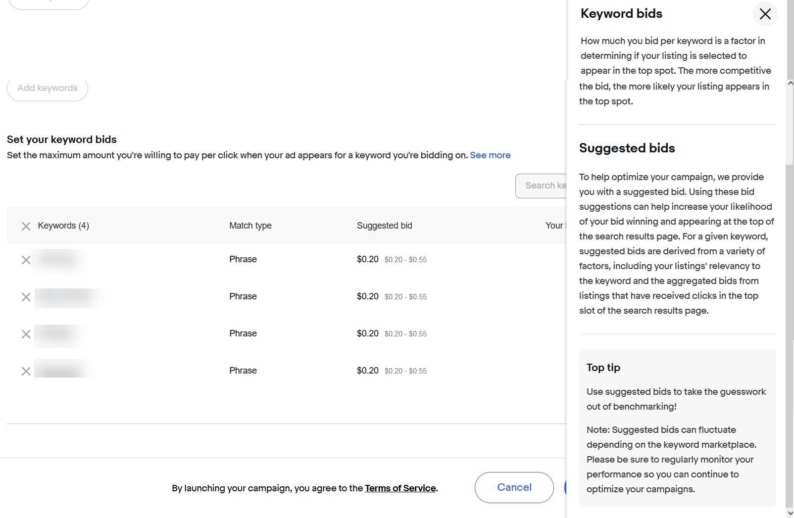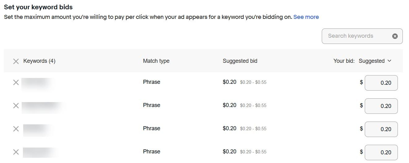 Once you've selected your keywords, now it's time to set the bids. eBay provides suggested bid amounts or you can enter your own.