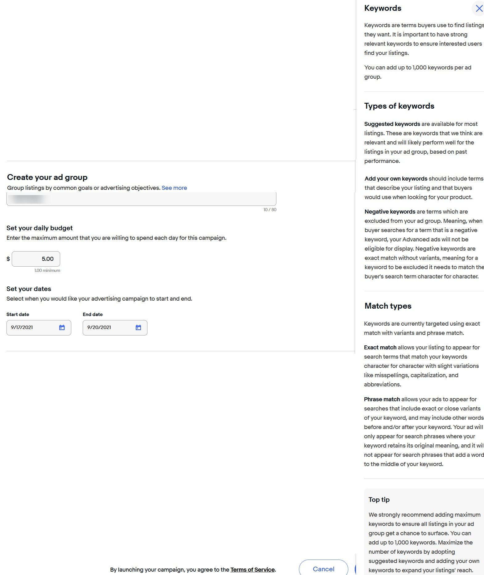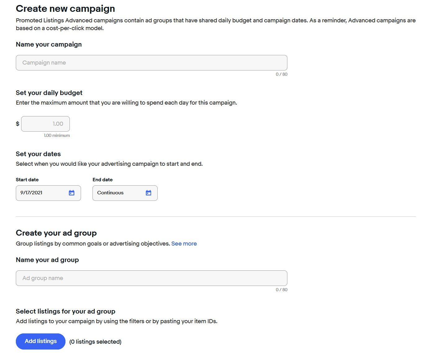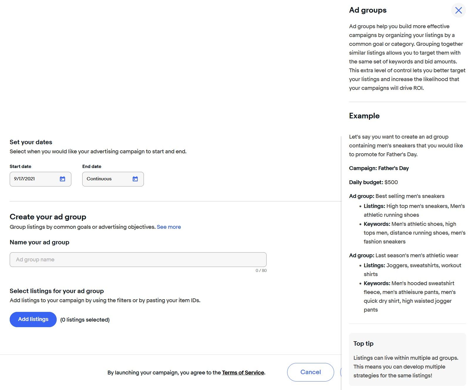Next you'll create ad groups and then add listings for each group. According to eBay - "Ad groups help you build more effective campaigns by organizing your listings by a common goal or category. Grouping together similar listings allows you to target them with the same set of keywords and bid amounts."
