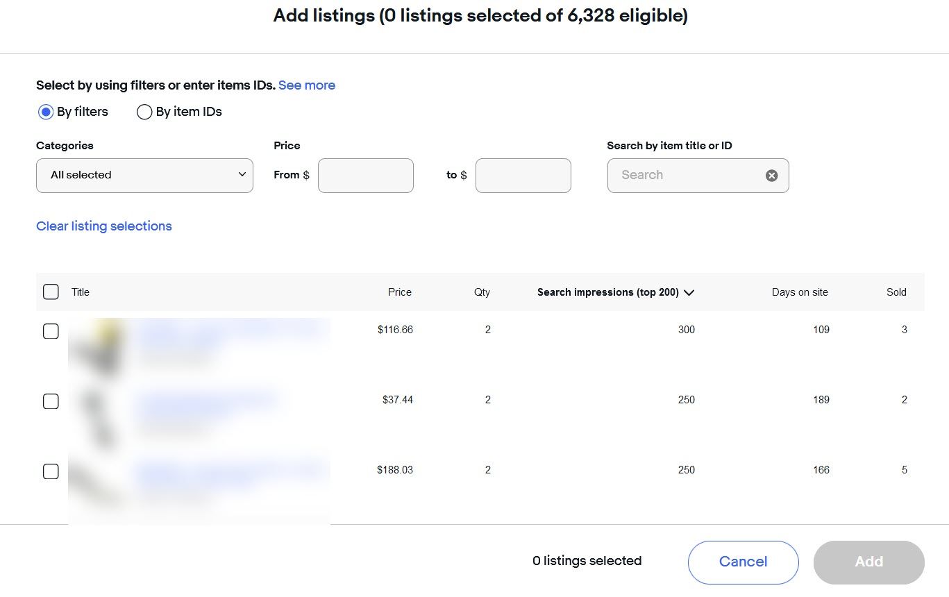When adding listings to an ad group, you can use filters by categories and price as well as search for specific titles or item IDS. eBay shows the price, QTY, number of top 200 search impressions in the past 30 days, days on site, and number sold to help you determine which listings would be best to advertise.