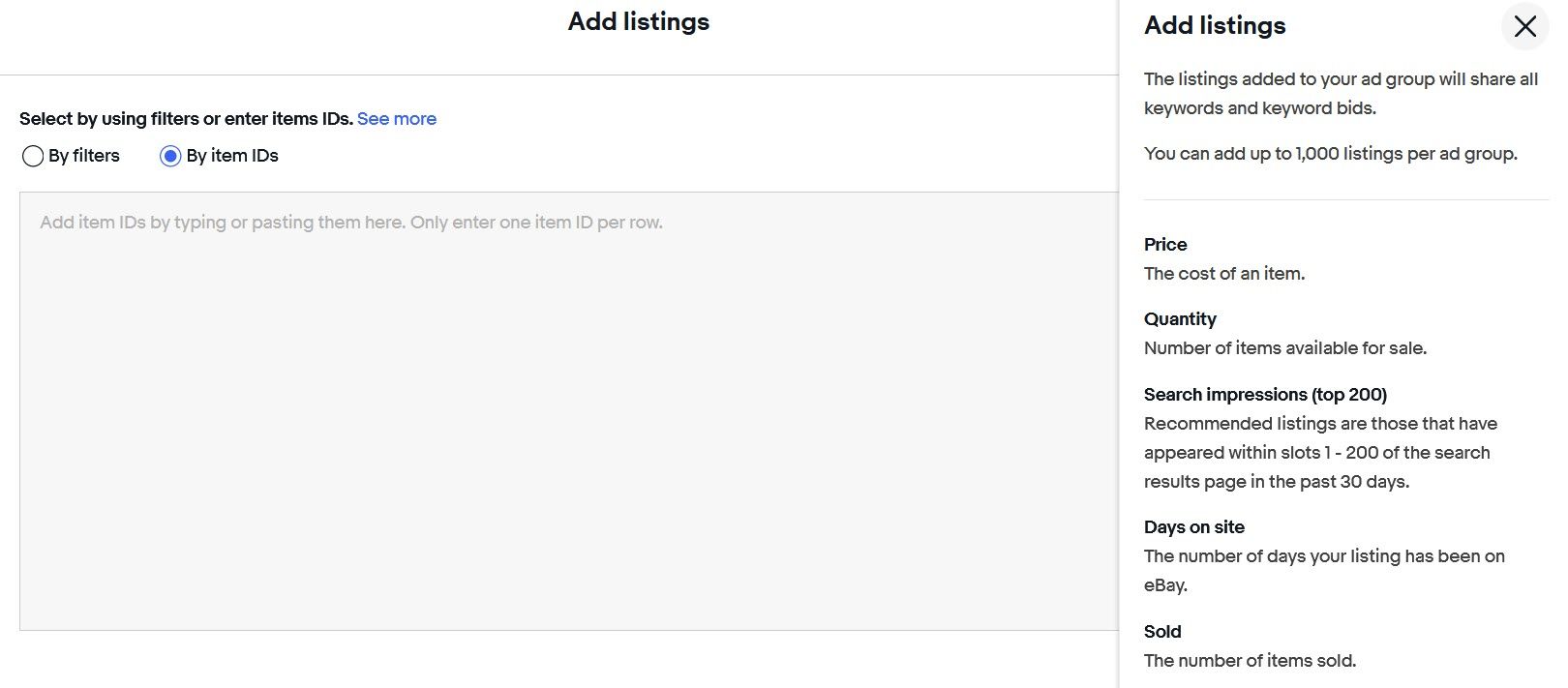 You can also just add listings by copying and pasting a list of item IDs (one per row) with a limit of 1,000 listings per ad group.