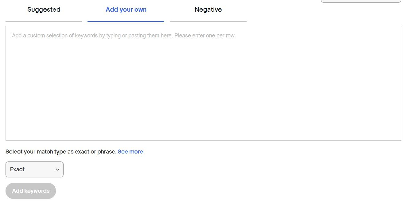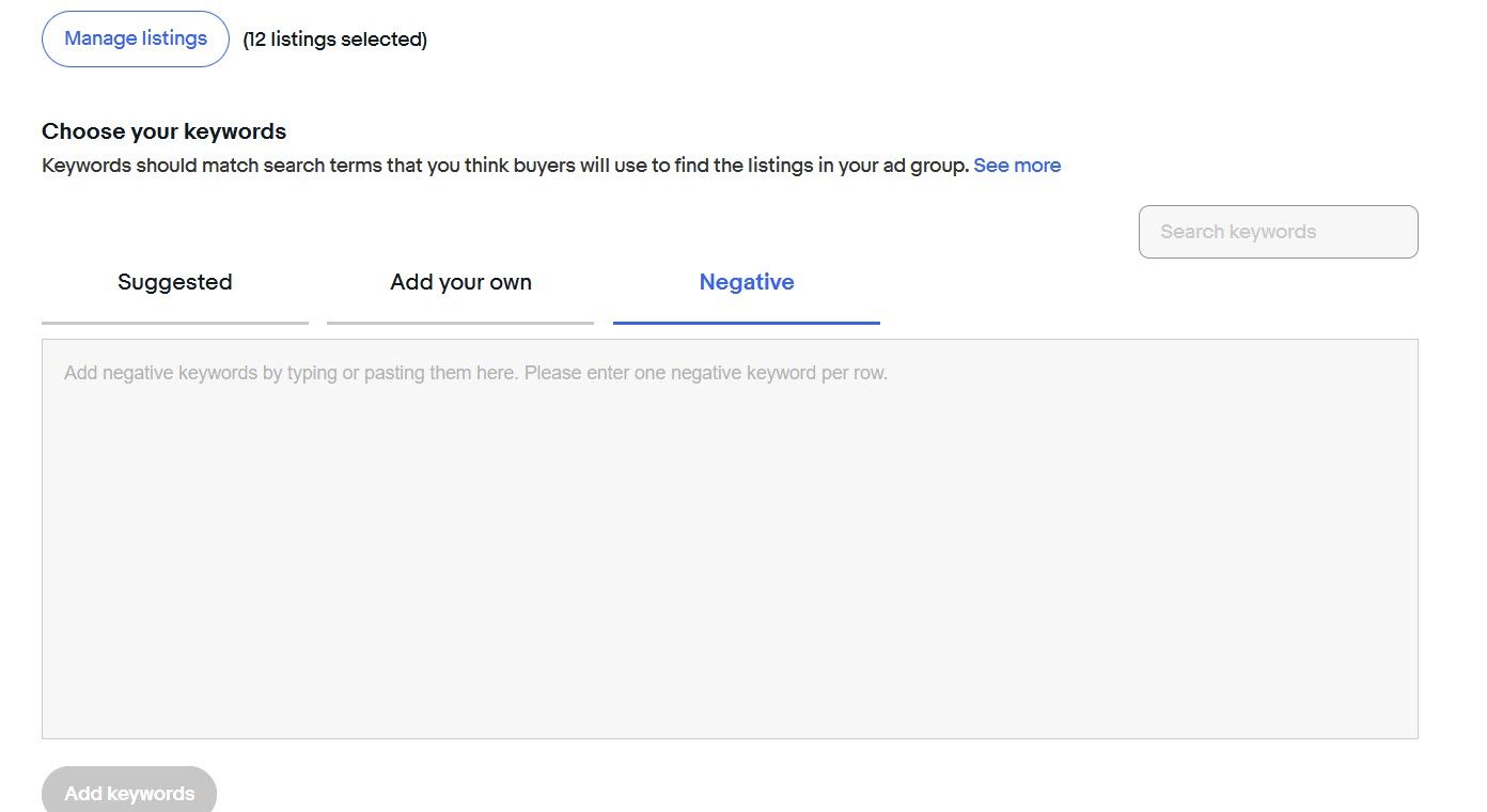 Suggested keywords are available for most listings. These are keywords that we think are relevant and will likely perform well for the listings in your ad group, based on past performance.