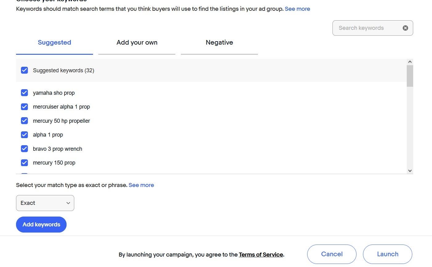 Next it's time to select keywords. The first section is keywords automatically suggested by eBay. In this instance, the items being included in the ad group were accessories that fit some of the boat motors listed here, but they were not propellers or wrenches.