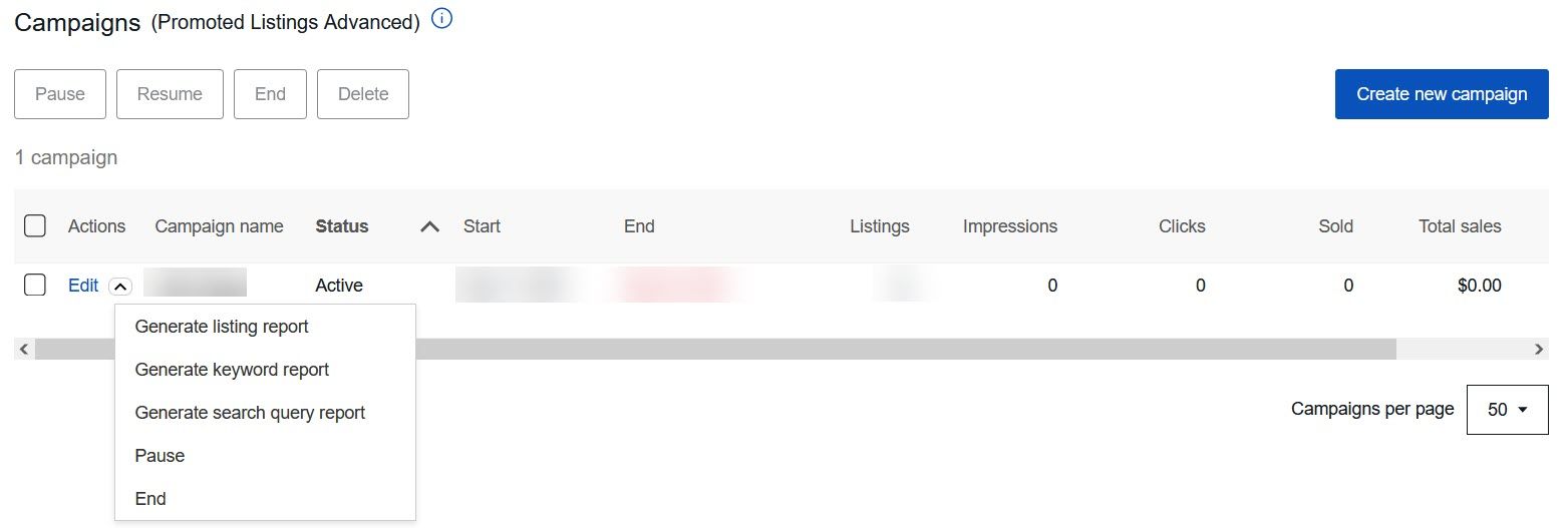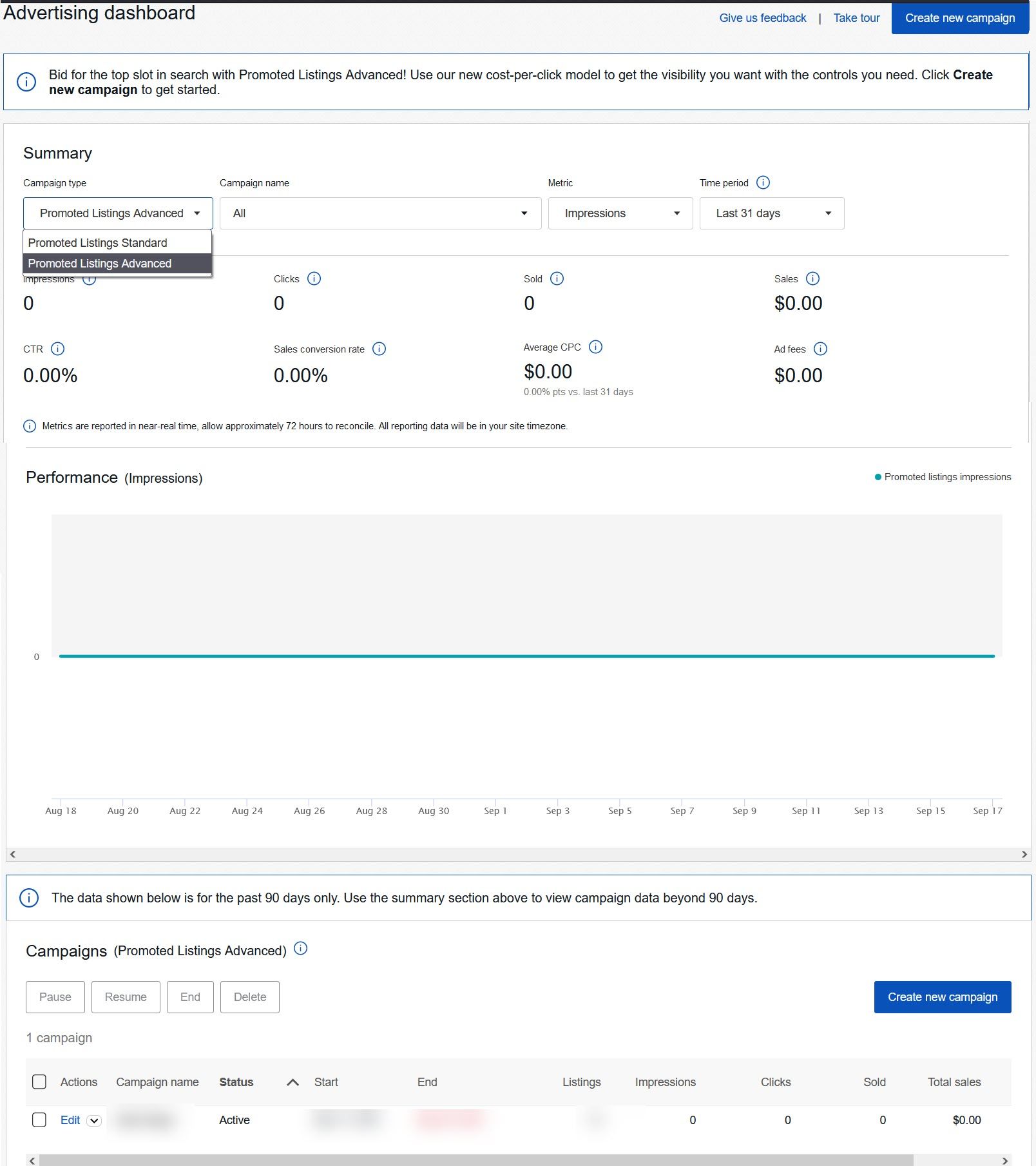 Once your campaign is active, you'll be able to track it in the advertising dashboard. Be aware if you use both Promoted Listings Standard and Promoted Listings Advanced, you'll have to use the drop down menu to toggle between the two.
