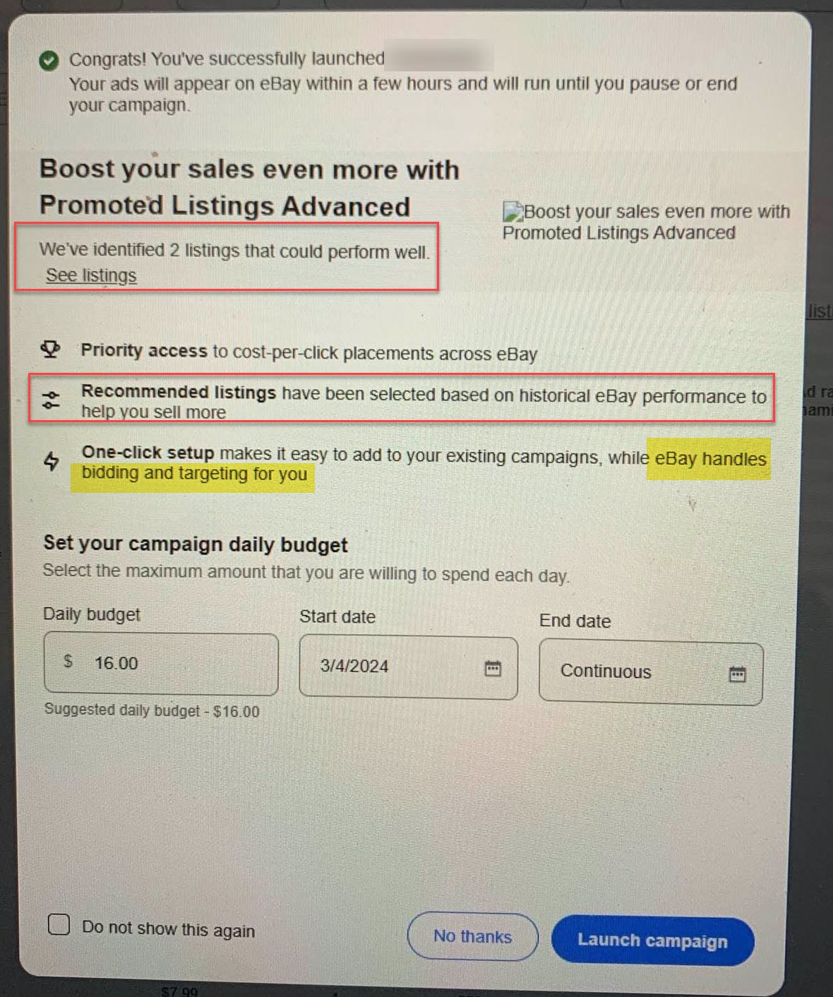The popup starts with a confirmation in smaller text at the top saying their Promoted Listings Standard campaign had launched successfully and a big blue button in the bottom right that says "launch campaign."