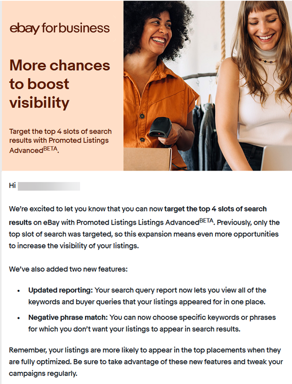 are expanding the placements of Promoted Listings AdvancedBETA ads on eBayCurrently, Promoted Listings AdvancedBETA ads are only eligible to appear in the top slot of search results, but soon this will expand to the top 4 slots.