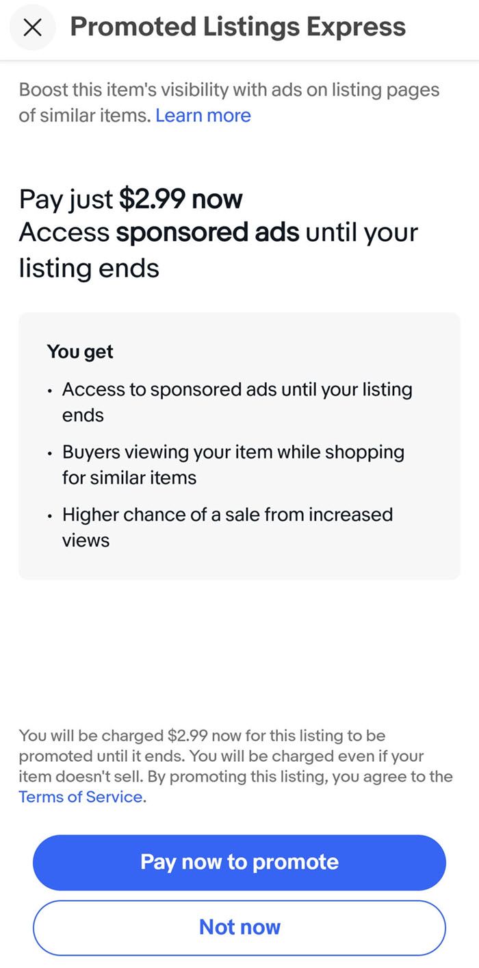 Rounding out our portfolio is Promoted Listings Express, a new way to advertise your auction listings. For one flat fee, your listing receives increased exposure during the auction period to help drive views, bids and sales. Promoted Listings Express is available to all sellers whose seller level is Above Standard or Top Rated with recent sales activity.