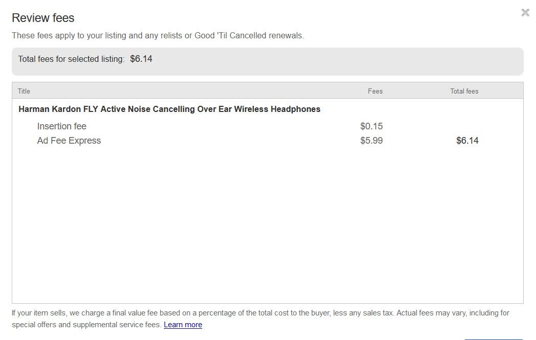 The PL Express fee will then be added to the total fees and if you click the fee amount, it will pop up a window with a line by line breakdown of all the listing fees.