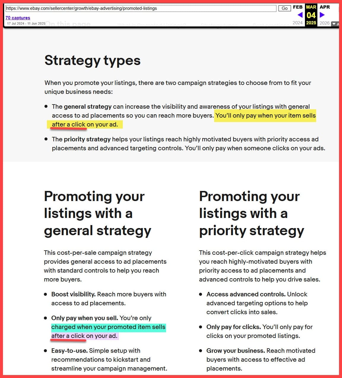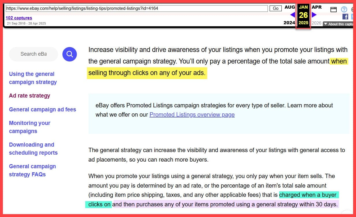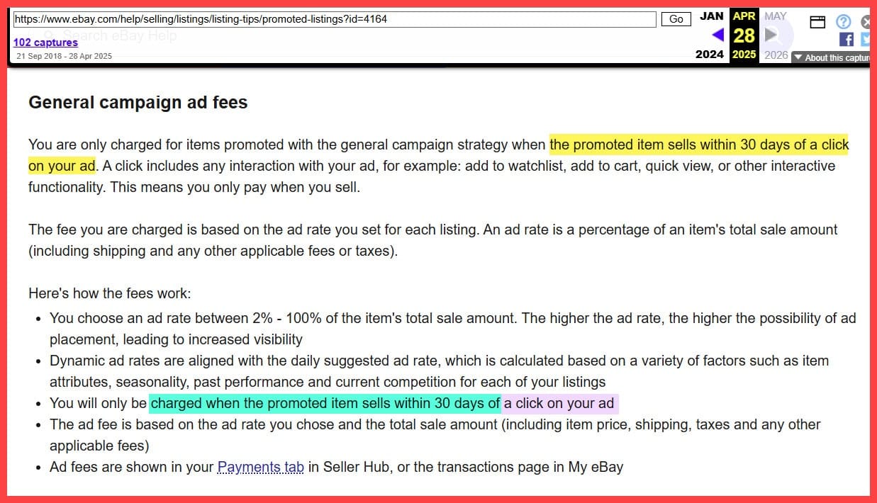 But Another Value Added Resource reader, Taylor Gipple, discovered that eBay has also changed the wording on this page in Seller Center to say you'll pay ad fees when "your item sells after a click on your ad" vs "when your item sells through a click on your ad.":