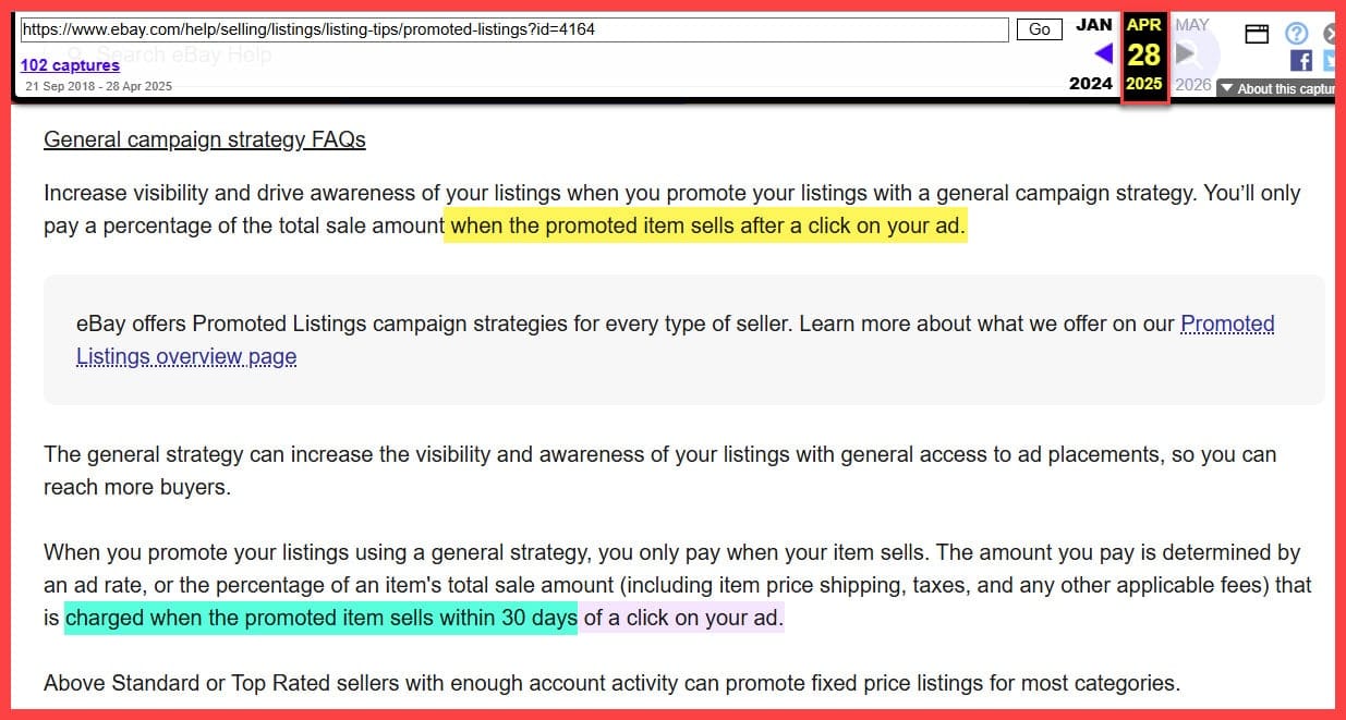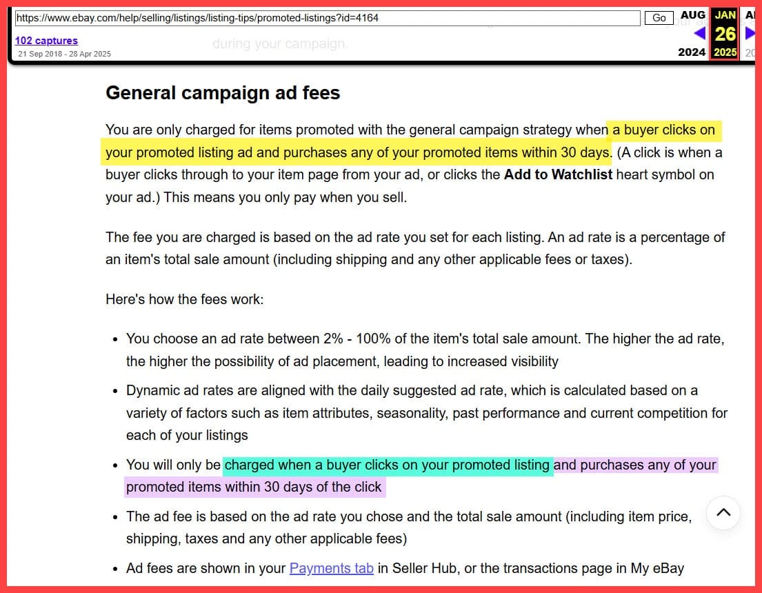 A Value Added Resource reader, Patricia, noticed that when creating a Promoted Listings General cost per sale ad campaign, the page now mentions that the ad fee will be charged when the promoted item sells within 30 days of a click on your ad.