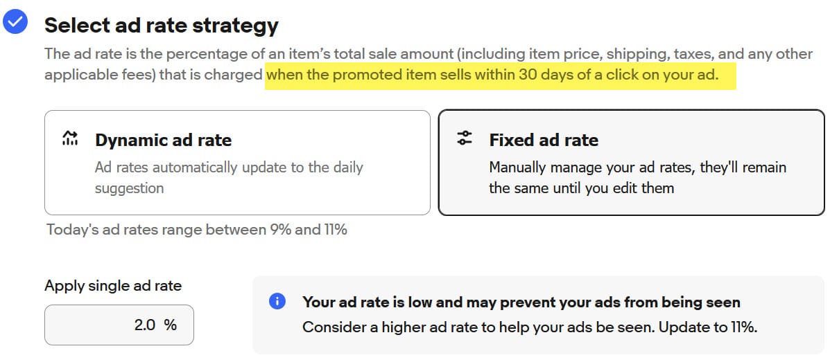 "The ad rate is the percentage of an item’s total sale amount (including item price, shipping, taxes, and any other applicable fees) that is charged when the promoted item sells within 30 days of a click on your ad."