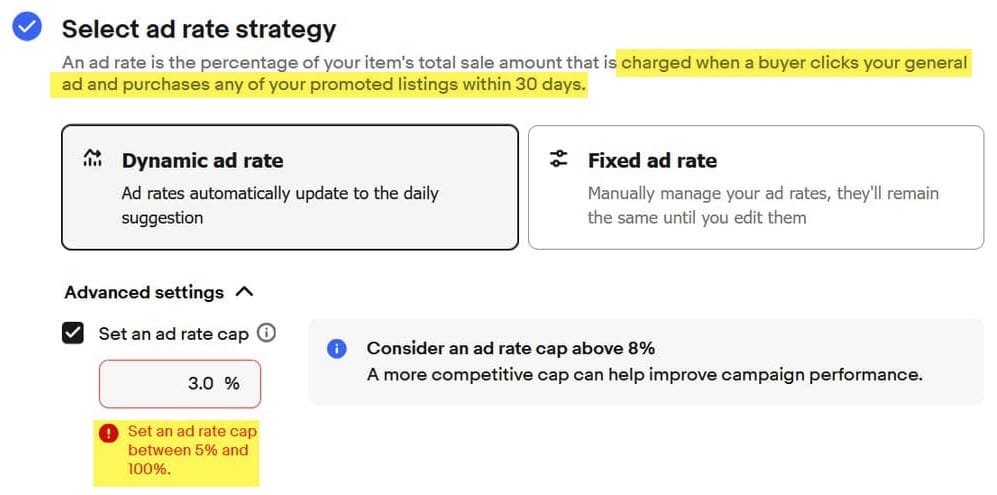 "An ad rate is the percentage of your item's total sale amount that is charged when a buyer clicks your general ad and purchases any of your promoted listings within 30 days."
