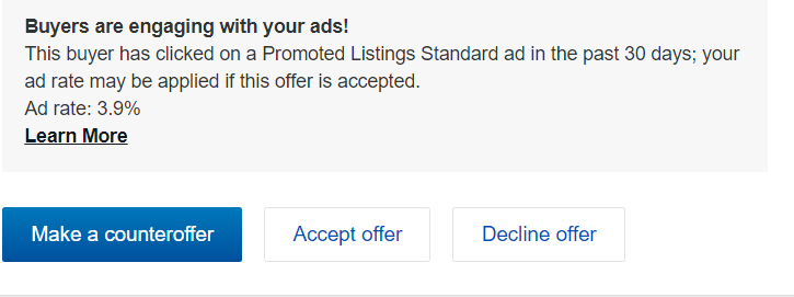 We are currently testing a new feature within the Manage Offers page. A small selection of sellers will now see a message indicating whether or not a Promoted Listings Standard ad led to this Best Offer, as well as the ad rate applied. We hope this will provide better clarity for sellers when accepting Best Offers.
