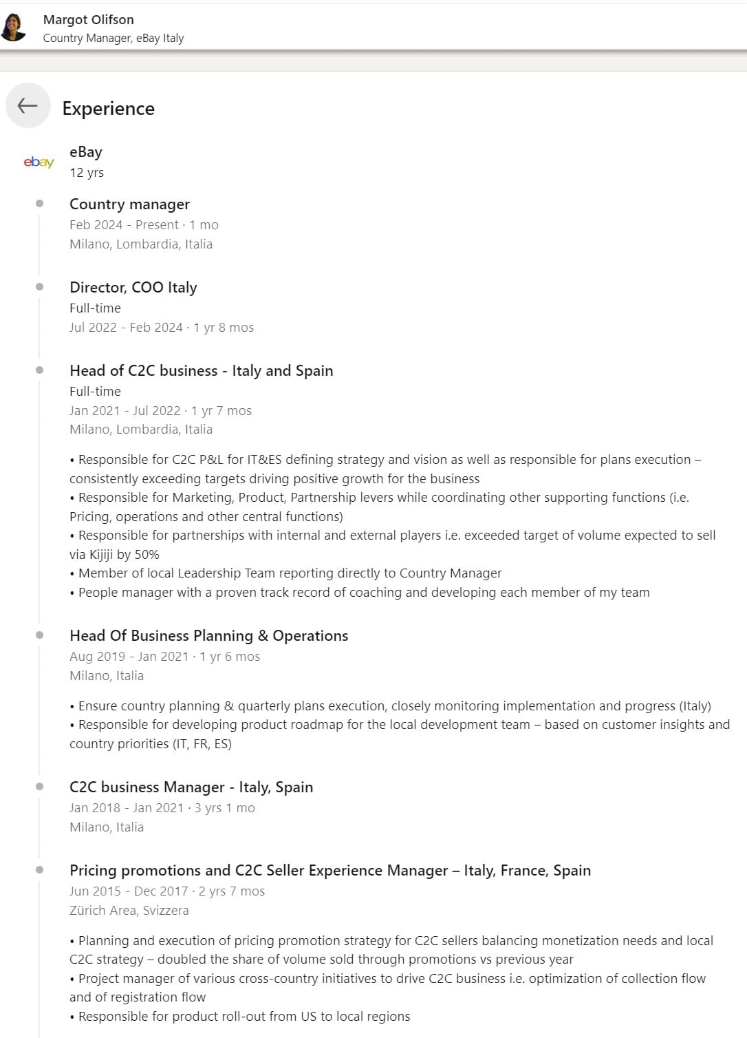 Olifson has spent years leading various C2C efforts in Italy, France and Spain, which makes her a strong choice as eBay looks to expand successful C2C efforts from Germany to other markets.