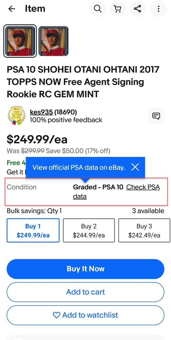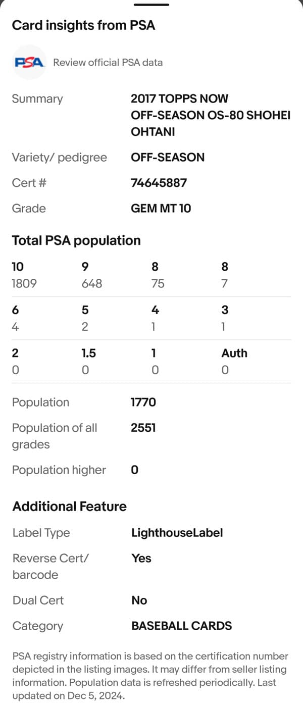 Tapping that link pulls up the full details from the PSA registry without ever having to leave the listing.