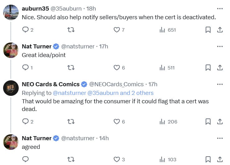 Responses to the post were overwhelming positive, with some collectors suggesting the feature could even be used to help notify buyers and sellers when the certification for a particular card has been deactivated.