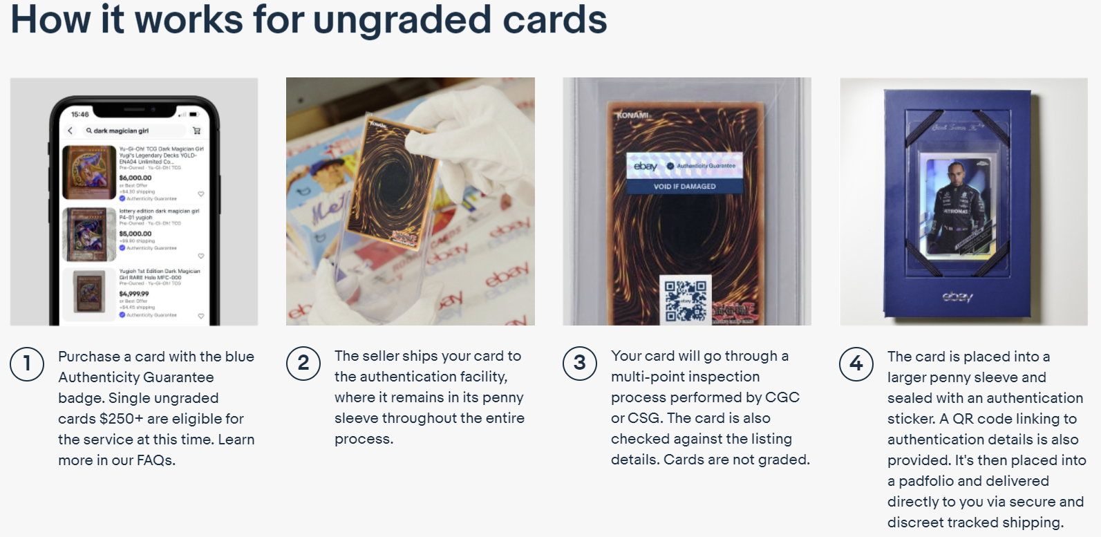 Authenticity Guarantee is available for individual sports trading cards, collectible card games, pack pulled autograph cards, and non‑sports trading cards $250 and above for ungraded cards, and $500 and above for pack pulled autograph and other graded cards. Check back for updates and new eligible price points.