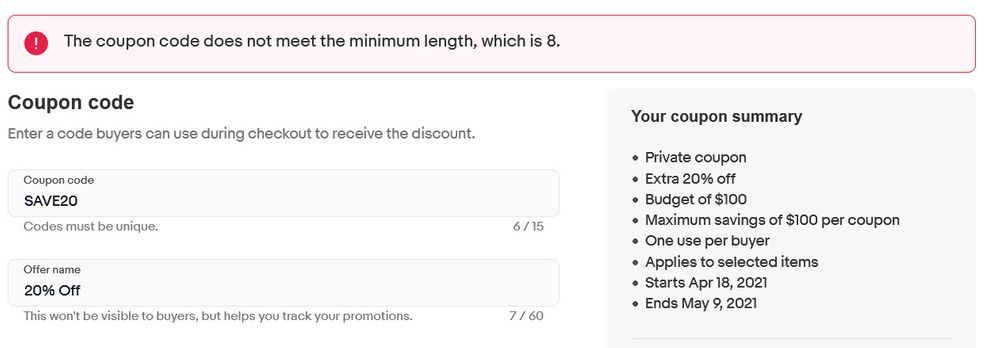 One minor execution flaw here though - they forgot to mention anywhere in the creation flow or demo videos that there is an 8 character minimum for the code, which could cause some friction and aggravation for sellers who won't know until they get an error message while trying to launch their promotion.