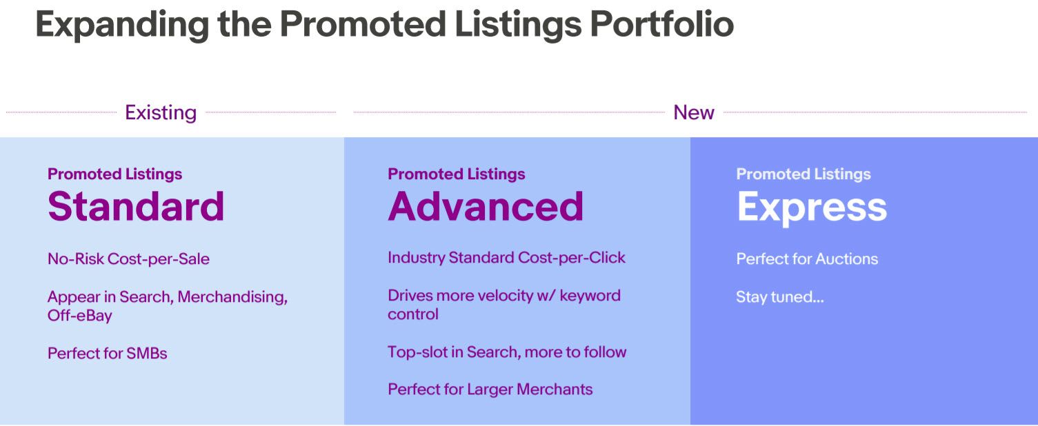 Promoted Listings Express [should be Advanced] is a CPC-based product, gives sellers the opportunity to drive more velocity, goes after a different type of marketing budget for that perspective and gives us the opportunity to work with a secondary and supplementary advertising format.