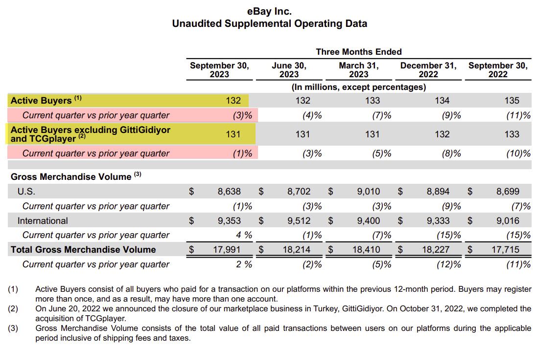 Total Active Buyers were reported at 132 Million, flat compared to last quarter and down 3% year over year, or 131 Million excluding eBay's closed Turkish marketplace GittiyGidiyor and trading card marketplace TCGPlayer acquired last year.