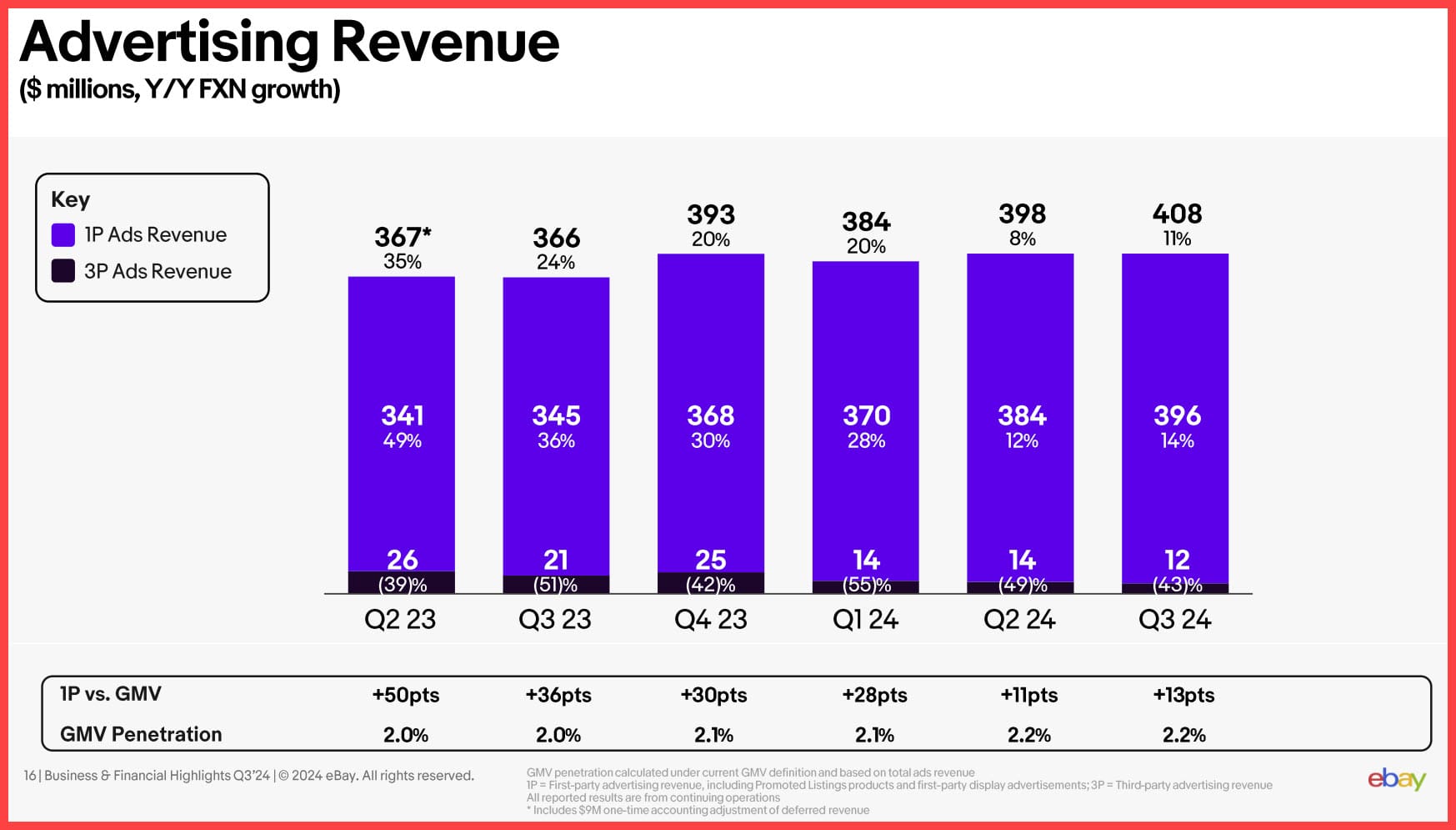 First party ad revenue from all of the various seller-paid Promoted Listings and Display Ad options) was $396 million - up 14%.