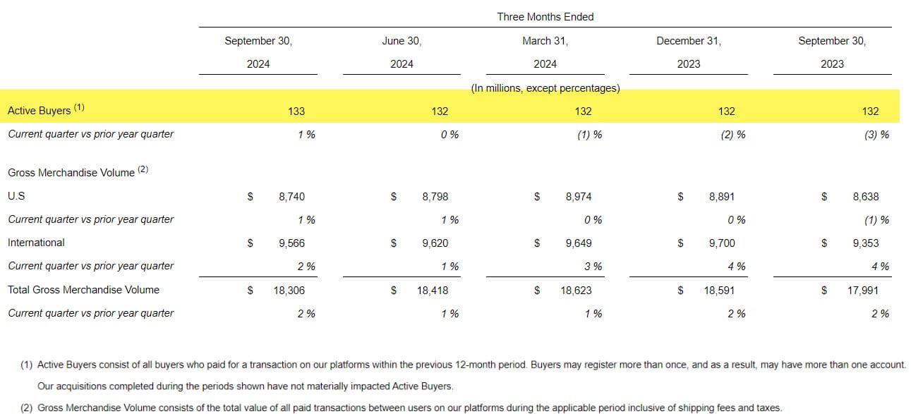 Total Active Buyers were reported at 133 Million, a 1% increase year over year - which is where they were in Q1 2023.