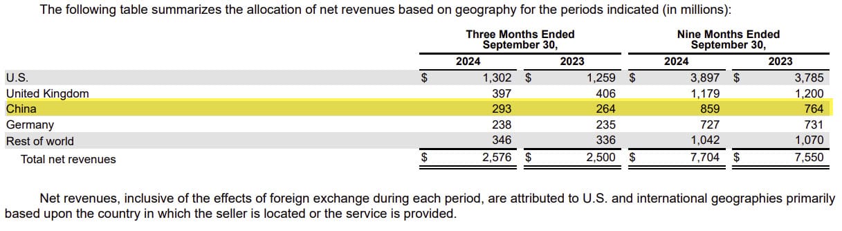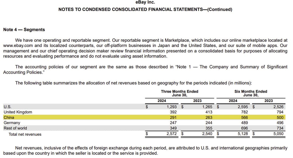 eBay's 10-Q filing shows that sales from China did in fact increase again in Q3, going from $264 Million in Q3 2023 to $293 Million in Q3 2024.